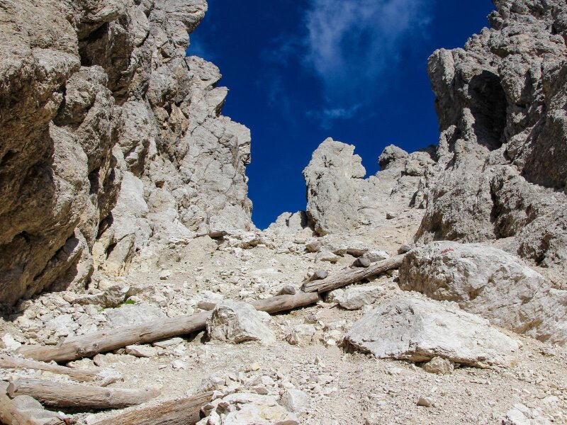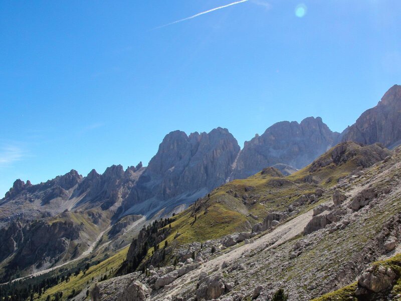 From here, the path leads steeply down towards the Vajolet Hut (which we do not reach). About 100 metres in altitude above the hut, an unsigned path leads us to the right. This is followed by an exposed section - please proceed with extreme caution! The path now climbs to a fork with a signpost for the Rifugio Fronza alle Coronelle. One final steep ascent, and we reach the Passo Coronelle, a scenic spot that is already in the Trentino Val di Fassa. From here, the trail descends very steeply, and after another 50 minutes, we arrive back at the Rifugio Fronza alle Coronelle.