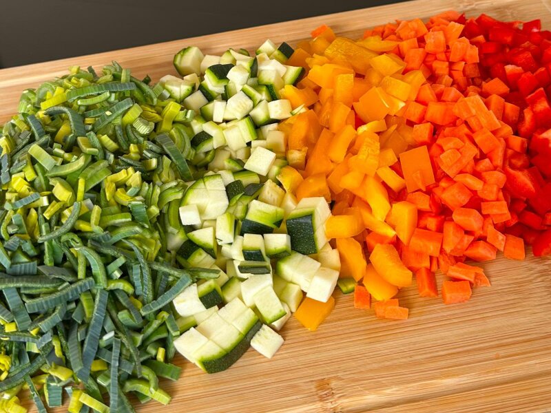 - Let them cool and in the meantime, finely chop the leek, peppers, courgette and carrots.