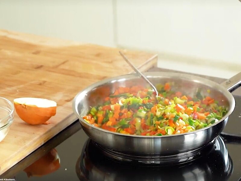 - Finely chop the leek, dice the red pepper and carrot, add them to the onion in the pan and sauté for a few minutes.