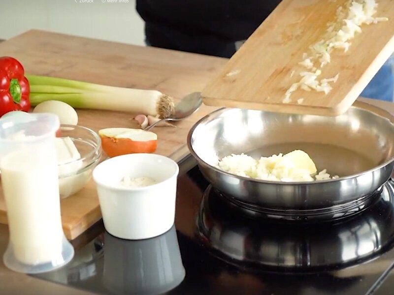 - Finely chop the onion and garlic and sauté in a pan with one tablespoon of butter.