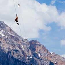 The starting point lies at 1,600 metres above sea level in the Fanes-Senes-Braies Nature Park. There, you'll be attached to a high-tech pulley. Then, it's a 3.2-kilometre descent, reaching speeds of up to 80 kilometres per hour, to where check-in and check-out are located. Breathtaking views of the valley floor, up to 100 metres below, and a fantastic panorama unfold beneath you.