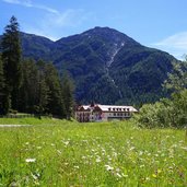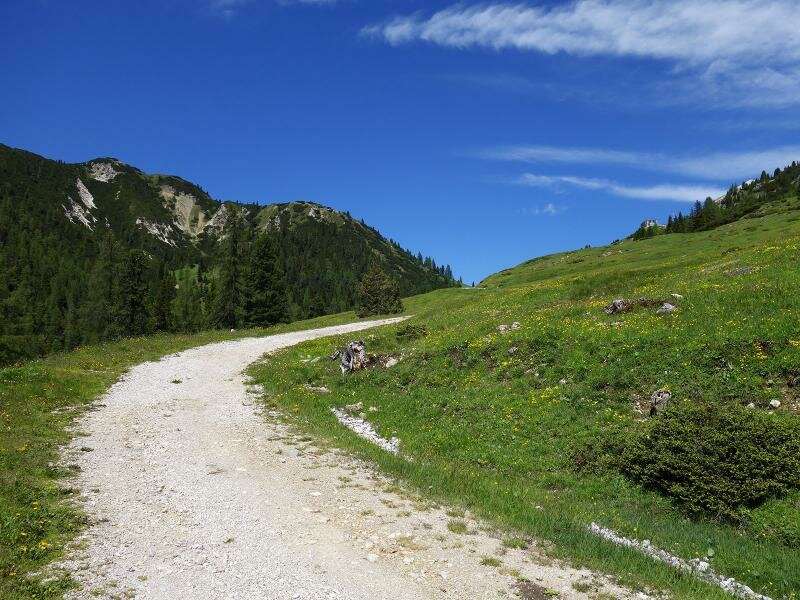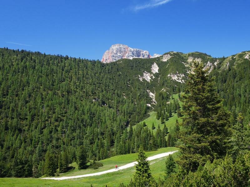 At the junction to Misurina / Tre Cime we keep to the right (towards Passo Cimabanche / Cortina) and after about 500 metres the forest road to the Prato Piazza meadows branches off on the right. Now the ascent is noticeable for the first time. 10 bends and 550 metres in altitude have to be mastered until we reach the highest point. The view on Monte Cristallo and the Croda Rossa d'Ampezzo, which dominates the alpine landscape of the Prato Piazza, opens already during the ascent. After having reached the top, we continue on a flat gravel path for about 3 km which leads from the Vallandro Mountain Hut to the Prato Piazza Inn.