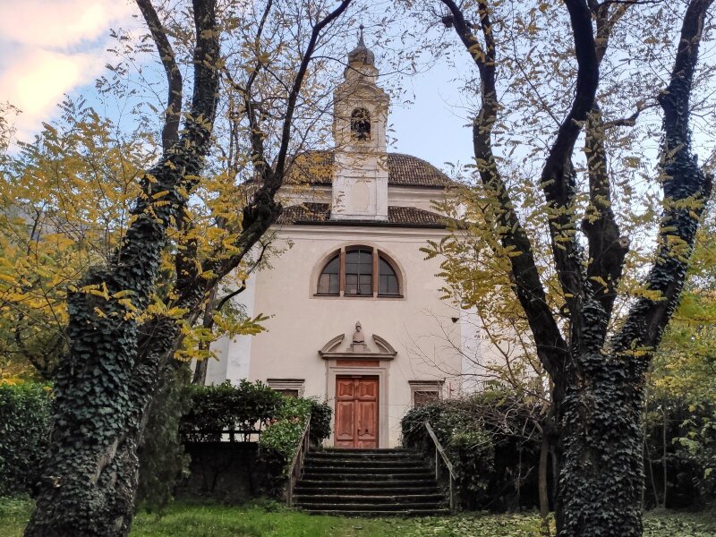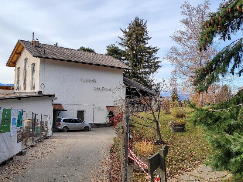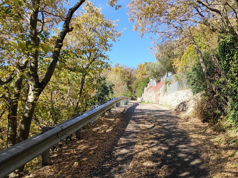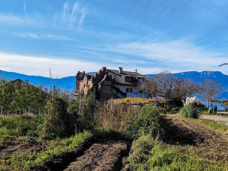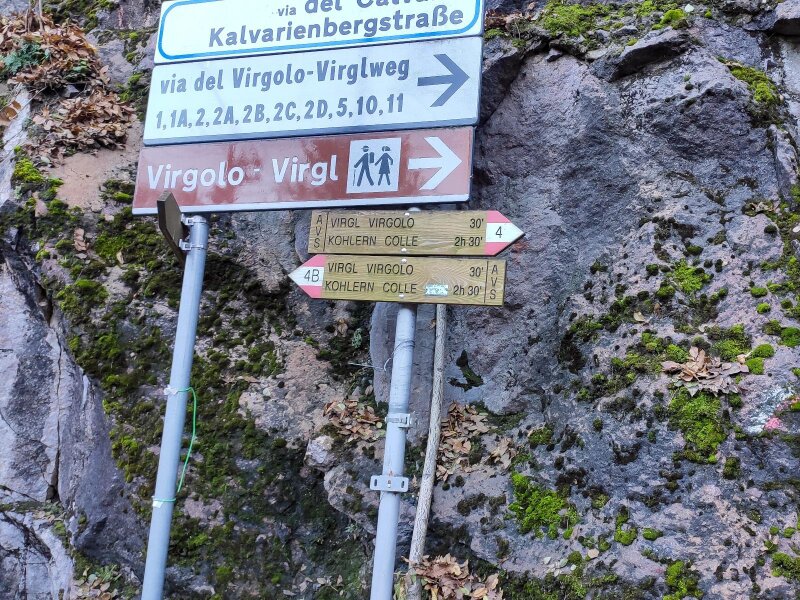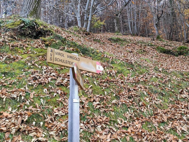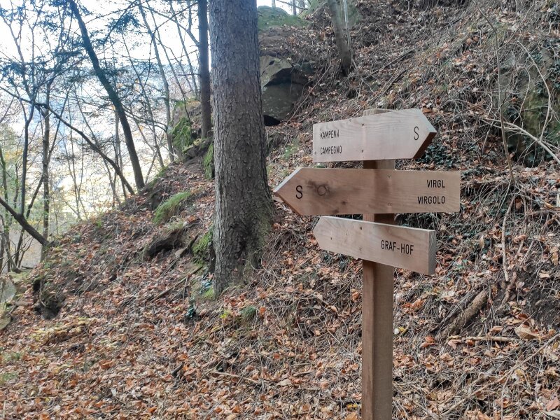 Today, it has been modernised. Our November hike is an alternative to the tour that leads directly up through the forest from the valley station. We begin before the station, at the "Virgolo di Sotto" car park along the road in Bolzano just after the tunnel. We follow path no. 4 towards Virgolo and Colle - the Italian name "Colle" means "hill". The asphalt road begins to climb steeply right away: We hike up to the Wendlandthof, ignoring the turn-offs along the route.