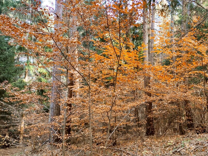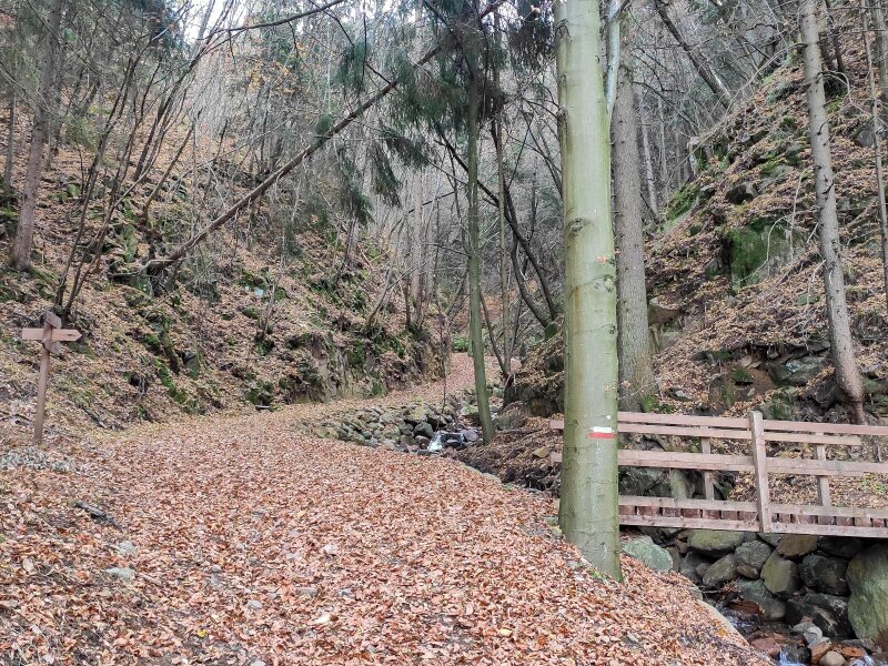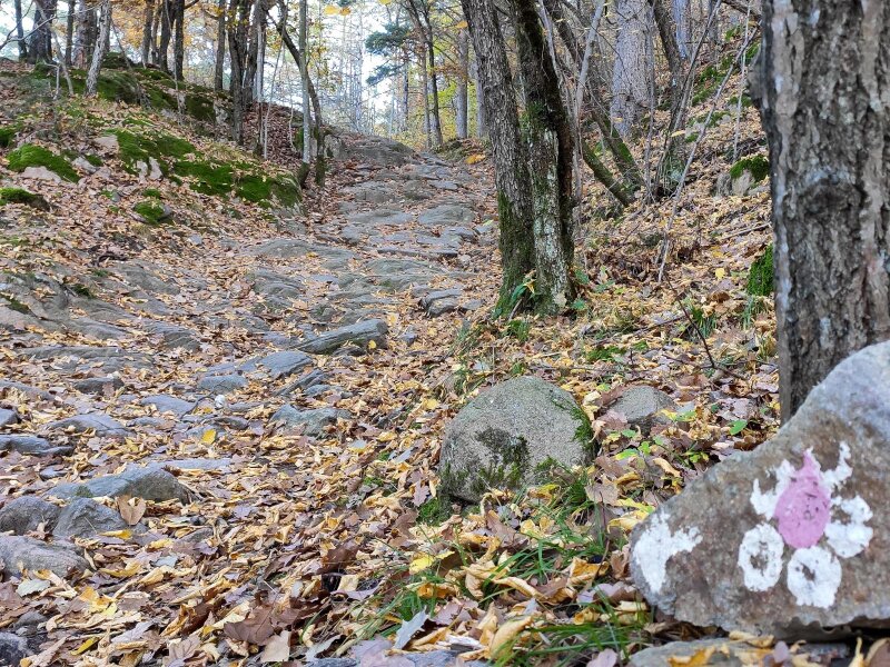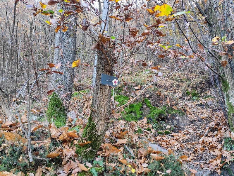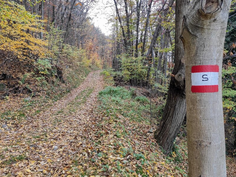 Shortly before the inn, we turn left, where a post indicates path no. 4. From this point on, the signposts are few and far between: We follow the markings on the path, which show a white flower with a red dot in the centre. All around, the beautiful autumn colours are on full display. The stones and roots on the path are covered with red, yellow, orange, and brown leaves, which we sometimes kick up, just as we did when we were children. The route continues steeply upwards.