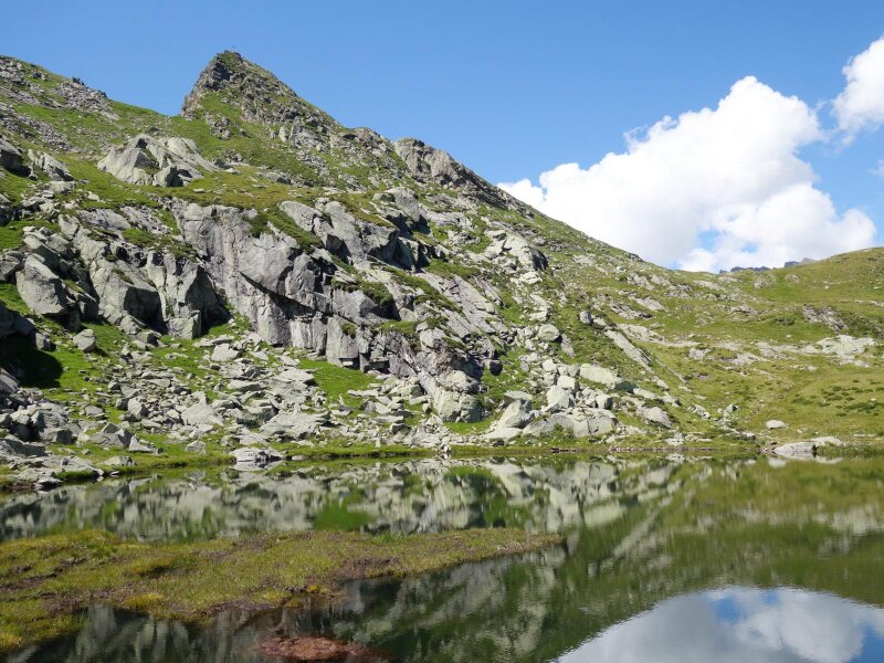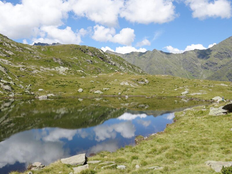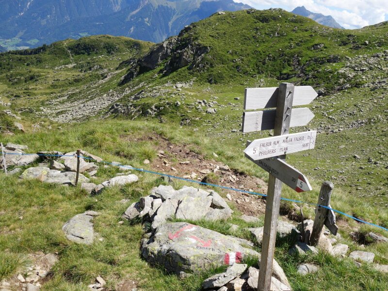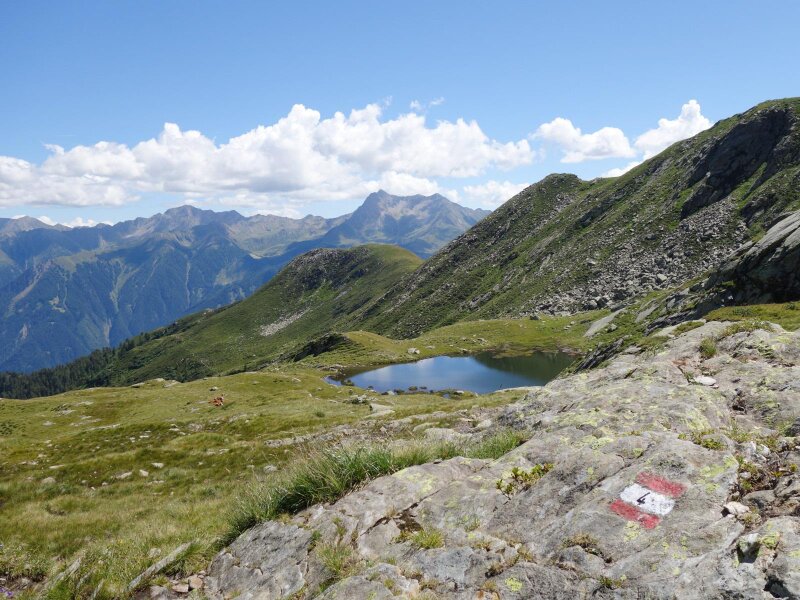 It lies below Lake Faglssee and is managed in summer, but we hike directly on to the lake and then towards the summit. The terrain is relatively steep but less exposed than on other summit tours. Once arrived at the Speikspitze, unfortunately little remains of the panoramic view: The surroundings are engulfed in fog. We start our return journey after a rest. We hike back to the Faglsalm Hut in a loop via the Giogo di Saltusio (Saltauser Joch, trail no. 4).