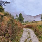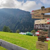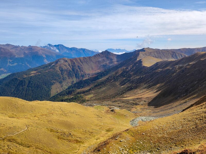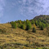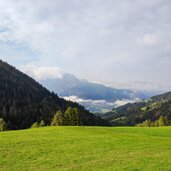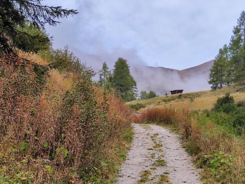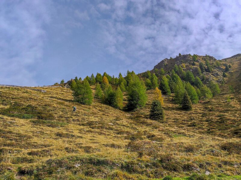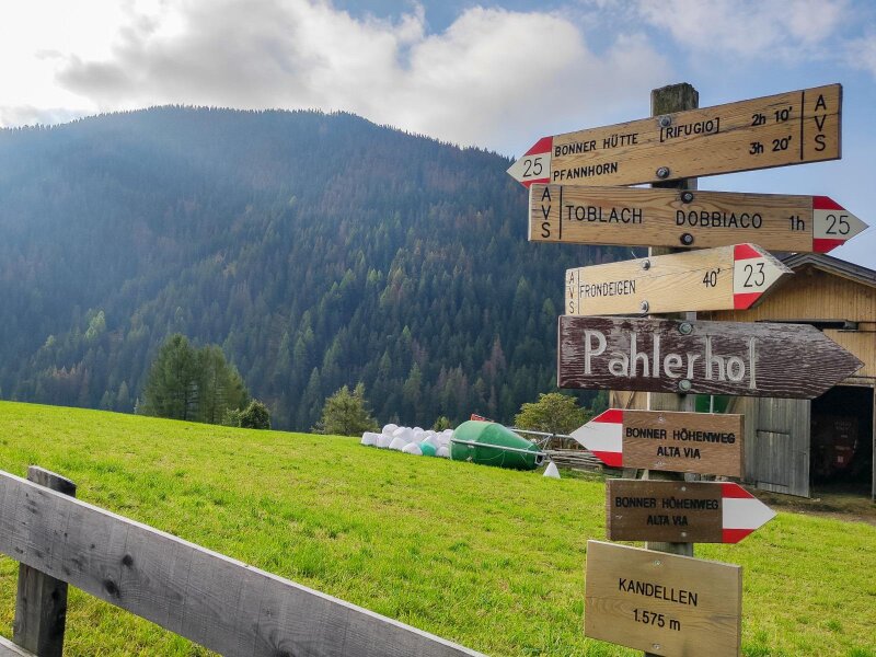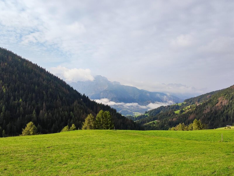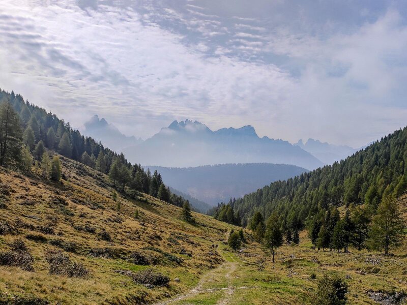 We begin our autumn hike in Kandellen near Valle San Silvestro in the Upper Val Pusteria, a mountain village near Dobbiaco. Now the ascent begins: Path no. 25 first leads us for about a kilometre on asphalt and then on a gravel track to a junction. We keep left and follow path no. 25A quite steeply up into the forest. As soon as it clears, meadows appear and behind us a beautiful view of the Monte Cristallo opens up.
