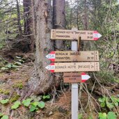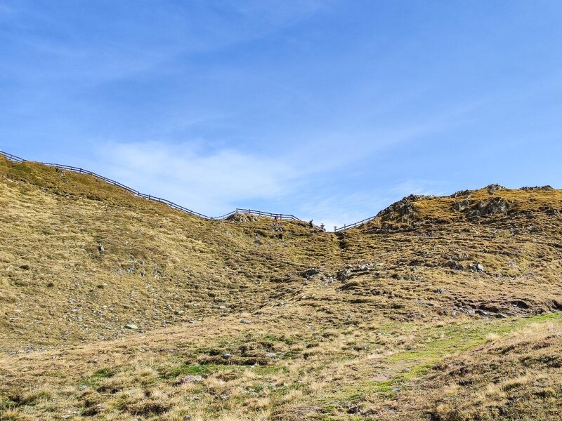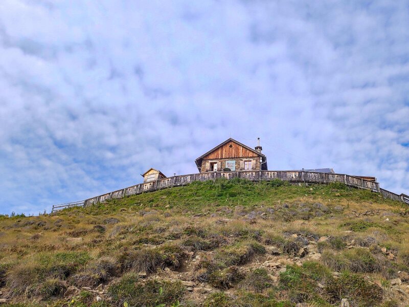After an hour and a half, the hike takes us to the Bergalm Hut at 2,090 metres. Afterwards, the route continues steeply upwards to the area called "Seelandboden" at 2,341 metres and to a junction: On the right, we can go directly to the Corno di Fana Hut (Bonner Hütte), and on the left, to the Forcella di Fana ridge on the border with Austria. We decide on the latter option. Once at the top, only a narrow pass separates us from Austrian territory. The view is magnificent!