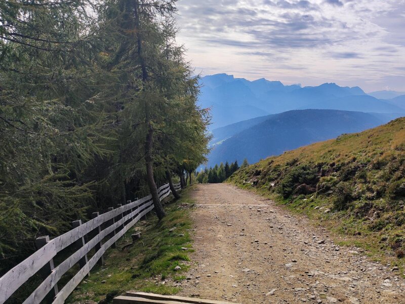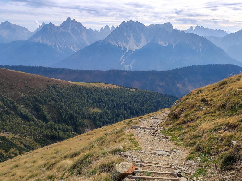 The panoramic view makes up for all the effort: The Sesto Dolomites, the Three Peaks of Lavaredo, the Monte Cristallo and the Grossvenediger in Austria stretch out majestically before us. We then descend to the Corno di Fana Mountain Hut and path no. 25. A slice of cake is just what we need now. Afterwards, we head down a gravel track in steep hairpin bends to a gate.
