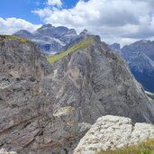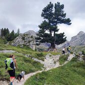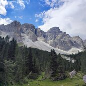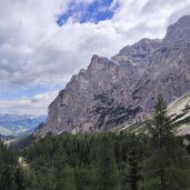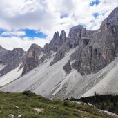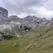 Soon after, we turn onto the forest road on path no. 6 leading into the valley. At a board with information on the Puez-Odle Nature Park, the mountain path leads up to the entrance of the wide basin of the Antersasc Mountain Hut (Zwischenkofelalm) at 2,085 metres above sea level. After the hut, we encounter the signpost "Puezhütte" and leave path no. 6 there: We now proceed to the right along the clearly visible mountain path with ground markings.