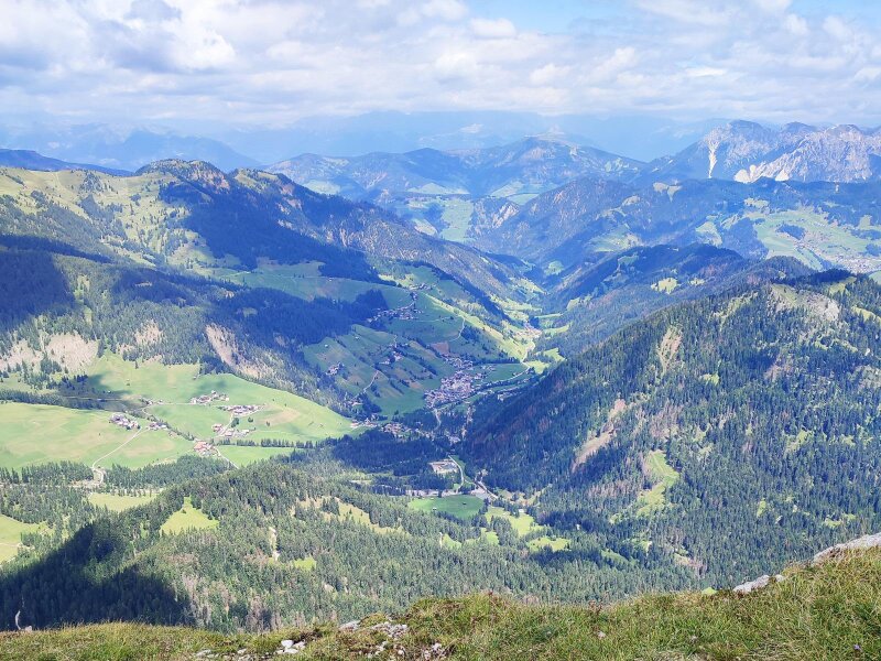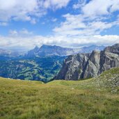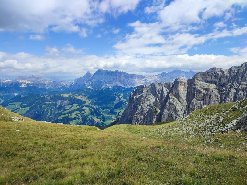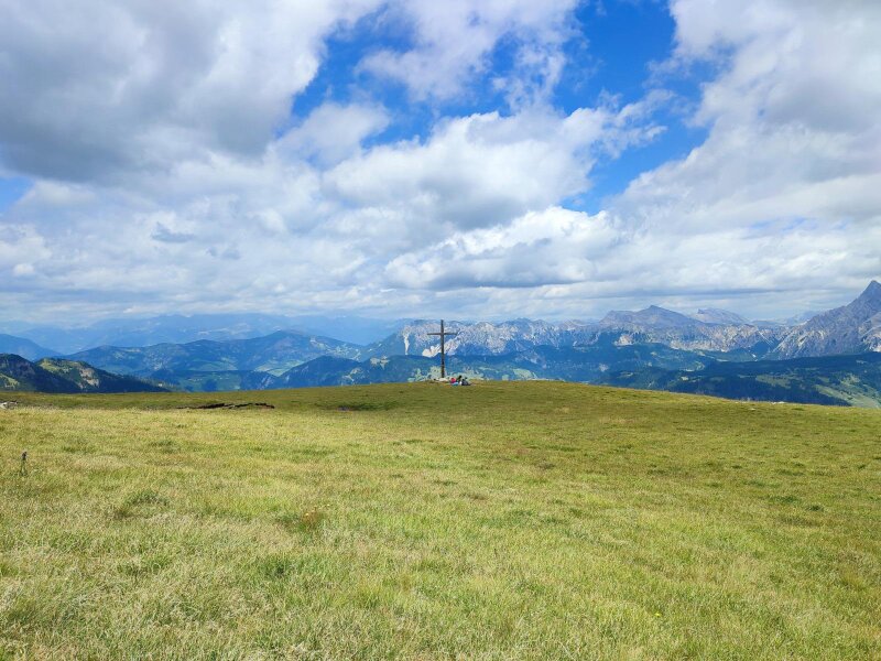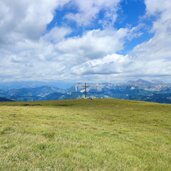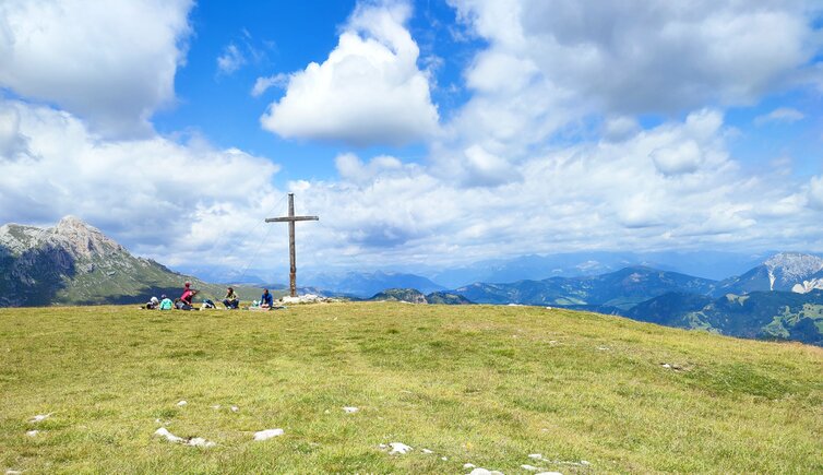 After a ridge, we cross hollows and overcome knolls until we stand in a wide basin. Briefly left again, and then the tour takes us in a wide right-hand curve over mountain meadows northwards onto the broad summit dome. The last few metres lead us almost on the flat over to the large summit cross on the Crep de Dodesc at an altitude of 2,394 metres. The view is simply fantastic. We then descend via the same route, arriving back at the car park in Longiarù after three and a half hours of pure walking time on this July day.