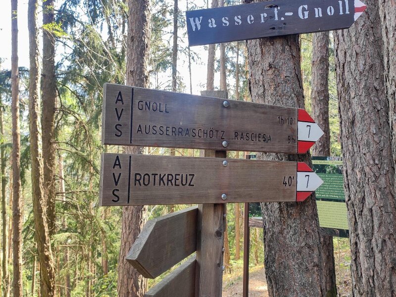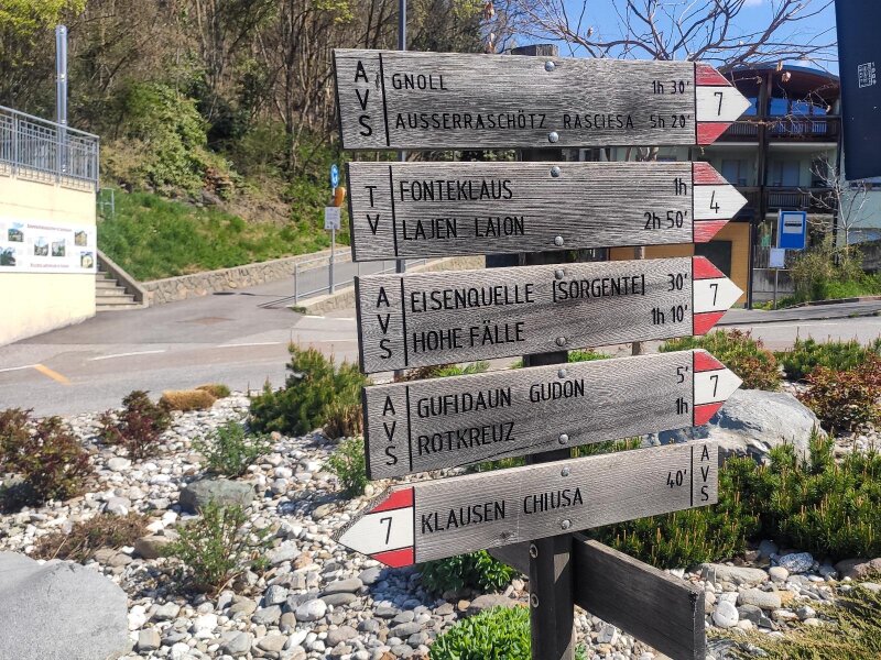 At the entrance to Gudon, the "village on the seven hills" in the municipality of Chiusa, there is a car park where we leave our car. Path no. 7, signposted "Gnoll", starts here and leads to the Gnollhof in about an hour and a half. The hotel is also a popular place to stop for refreshments, and on this April day, the hike is accompanied by a magnificent display of blossoms. The asphalt road leads to a junction, where we first keep left and then bear right at the next fork.