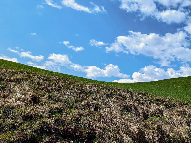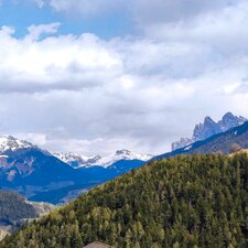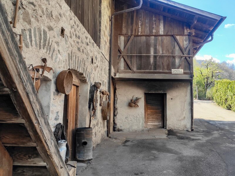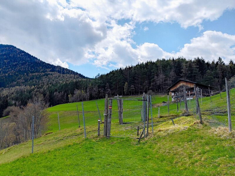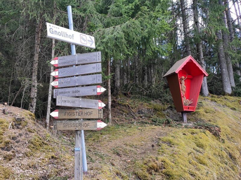 Another half an hour, and we have reached our destination, the Gnollhof. We are at an altitude of 1,157 metres. This would be a good place to stop for a bite to eat, but we know that it is closed in March and April, except for the Easter period, after which the summer season begins. In the distance, the peaks of the Odle Group stands majestically. On the sun-drenched hilltop above Gudon, we enjoy the feeling of spring and the first warming rays of sun on our skin.