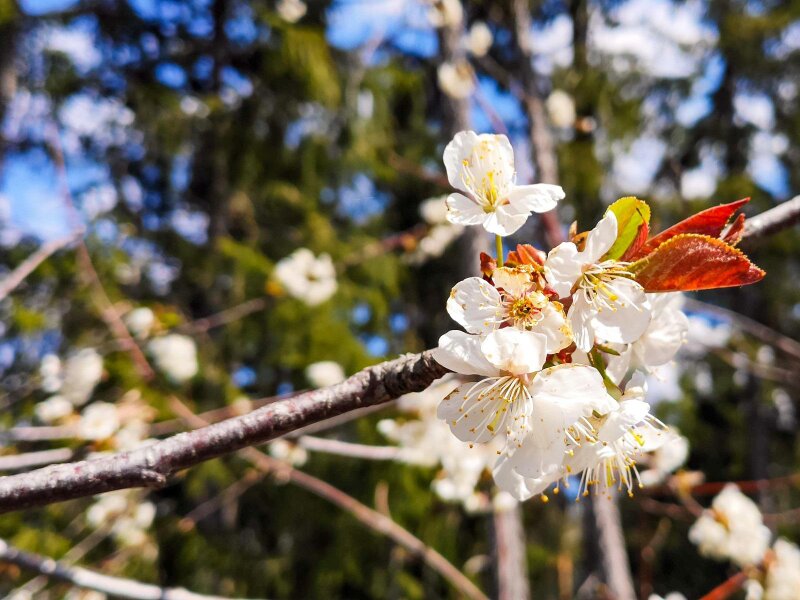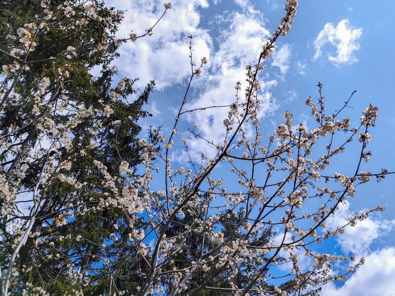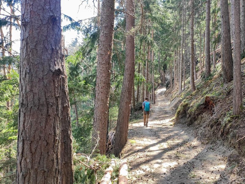 We follow the signs until we cross a small bridge and enter the forest. Here, the road turns into a gravel path but continues to wind its way gently uphill. After an hour of walking, during which we see snow-capped peaks in the distance and blossoms on the trees all around, we reach another asphalt road. Another five minutes later, we head back into the forest, continuing on path no. 7.