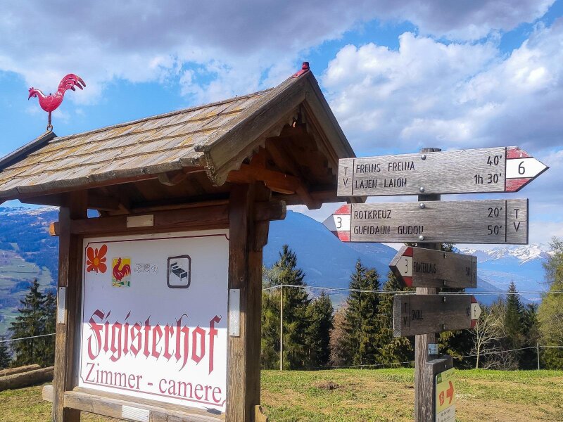 Then it's time for the return journey: We follow the road to the Figisterhof, a traditional farm tavern, which is followed by a ten-minute section on path no. 3. After that, we turn right onto the hiking trail (be careful, as there are few signs here) and follow it until we rejoin the path we took on the way up. This leads us directly back to Gudon and our car. Gudon is also easily accessible by public transport from Chiusa (a seven-minute journey).