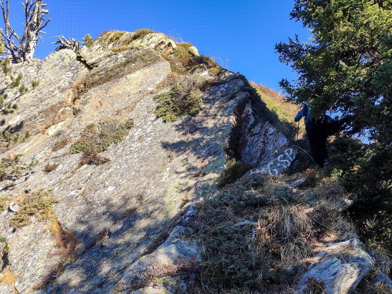 A few minutes later, a small sign points to the right, and the path becomes a little steeper. A white and red trail marker leads us into the forest; the gravel path is manageable without much difficulty. After about 45 minutes, we reach a high plateau with a large stone marked in red and white, which we continue to follow. There is also a sign from the Alpine Club indicating a shorter route: We will choose this path for our return journey. The path is somewhat overgrown.