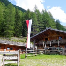 We reach the alp at 1,640 m a.s.l. after about one hour. From here we continue uphill through the valley. At about 1,800 m a.s.l. it gets steeper and the trail changes - instead of the forest road the route follows now a partly paved mule track which leads along the rock on the eastern side of the valley. From the valley gorge we reach the timberline, where a natural wet meadow landscape expands. Here lies the Seefeld Mountain Hut (Seefeldalm).
