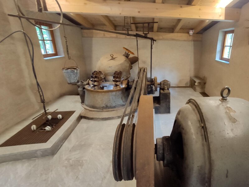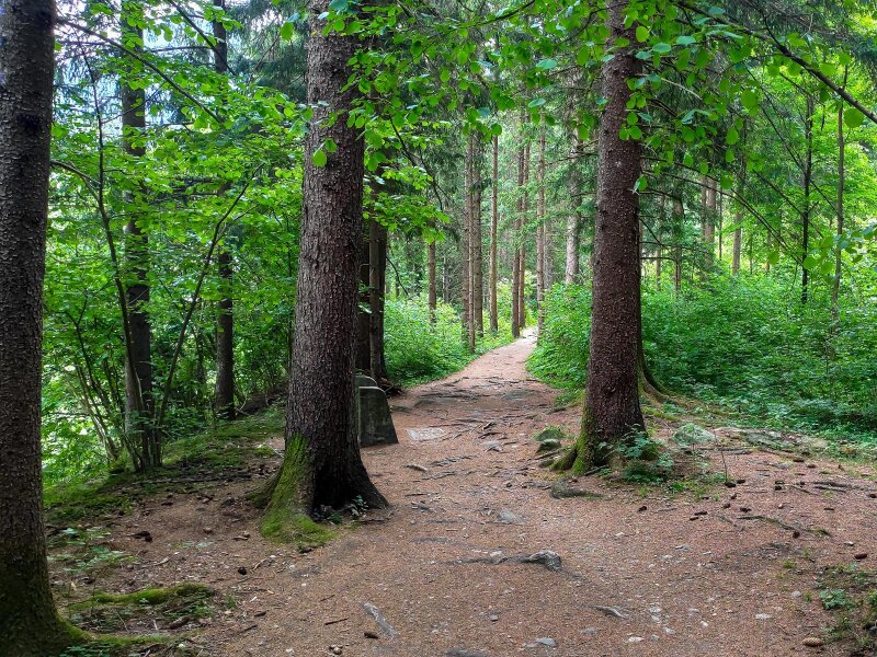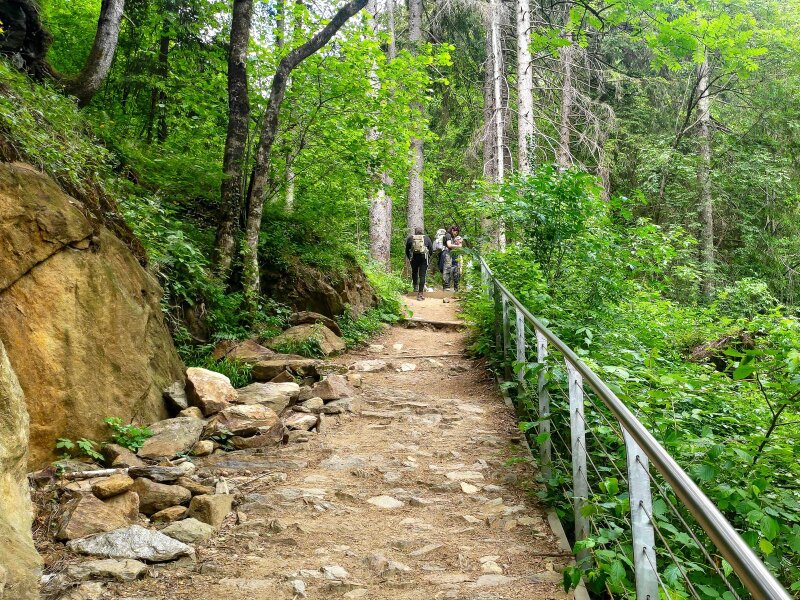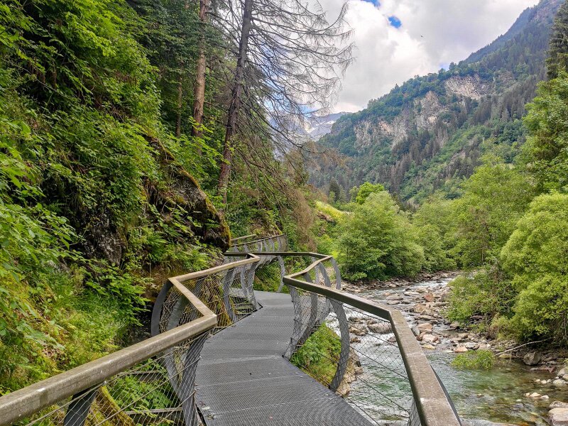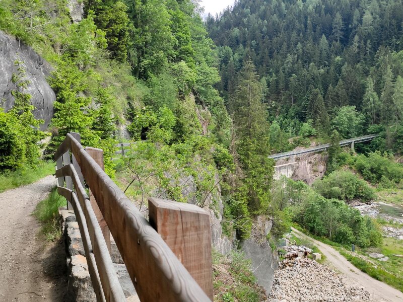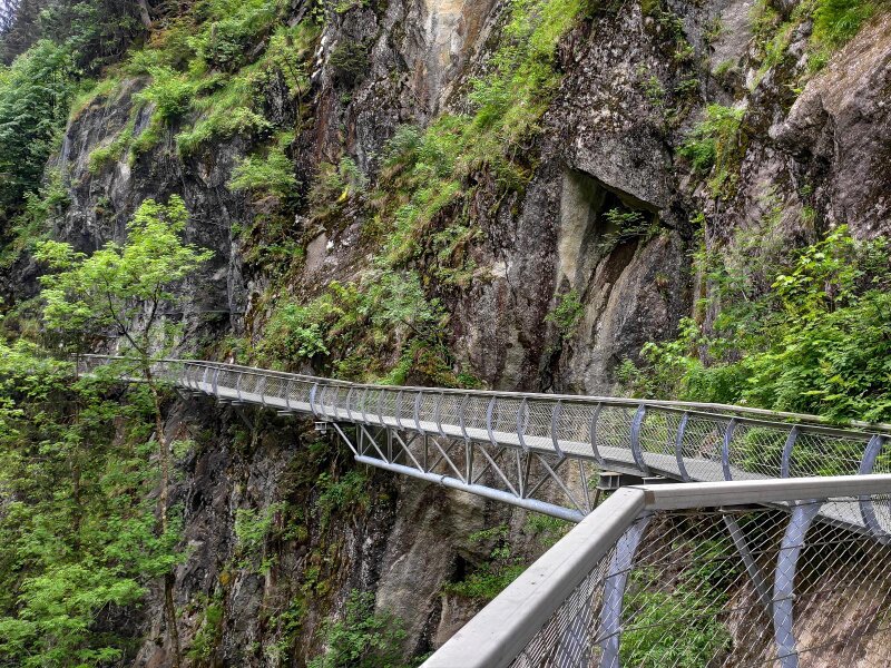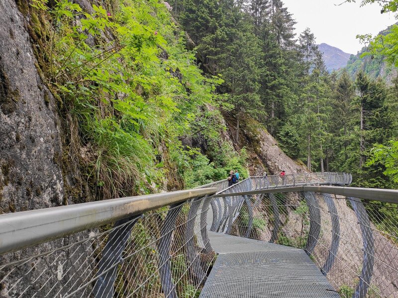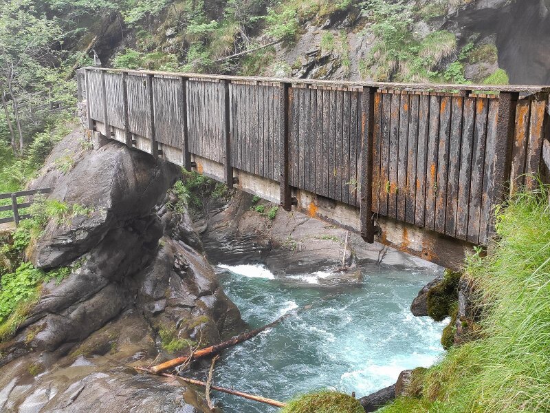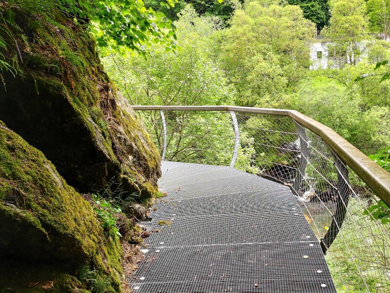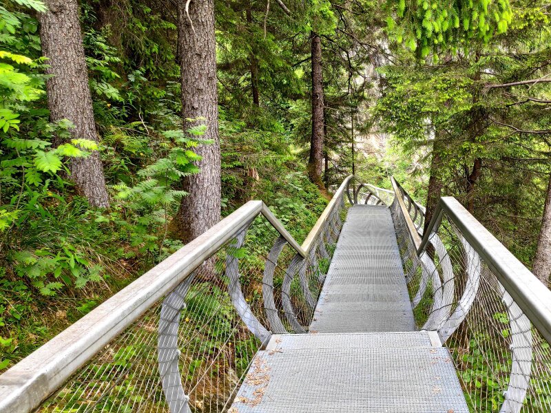 We follow the sign for the "Passerschlucht". First, it is an asphalted road, then a gravel track, marked with the number 1. After a few minutes, we reach a bridge on our left, which we cross, then turn right to follow the path into the forest. Soon after, we see the first steel structures. Boardwalks, bridges, and viewpoints alternate, and we even pass an old, abandoned power plant.
