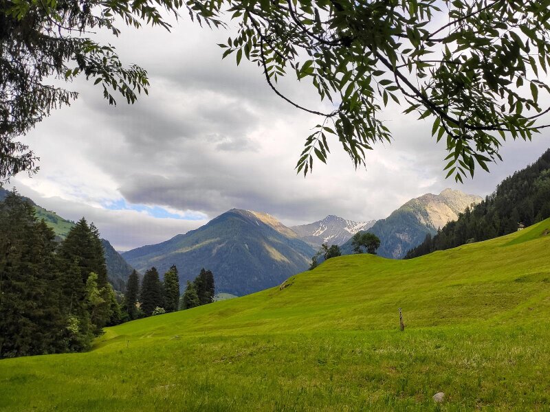 The path leads us across a bridge to the junction for Moso in Passiria. Here, we follow path number 1A, which leads quite steeply uphill and merges with another junction after ten minutes. At this point, we keep right, follow the signs towards Moso and the Stieber Waterfall, and hike through the Val Passiria alpine meadows. Soon, the path joins an asphalted road: We keep right, leave the Sanderbad inn behind us, and follow the small path that descends steeply.