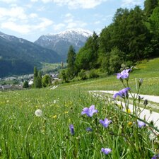 From Malles in Val Venosta (station) we take the Swiss Postbus driving through the Val Monastero valley across the border to Müstair. After a visit of the monastery Son Jon (St. John), founded by Charlemagne in 775 AD cand featuring beautiful frescoes of the Carolingian period, we walk out of the village across the Plaz Grond. The path leads across lush meadows covered by flowers to Tubre in Val Monastero (Taufers im Münstertal). The border is traversed unnoticed, the only thing we become aware of is that the signposts are now in German, no longer in Romansh, so we reached Italy. Short before reaching the village of Tubre, the signpost indicates the way up, through the forest we reach an an altitude of 1,500 m a.s.l.