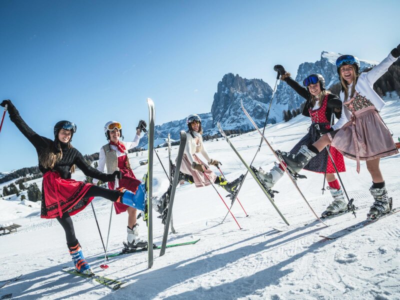It is March 8 when International Women's Day draws attention to women's rights. Yellow mimosas, representing sensitivity and strength, can be seen everywhere on this day - but on the slopes of the Val Gardena-Alpe di Siusi Skiing Area, it is Dirndl that adorn the runs.