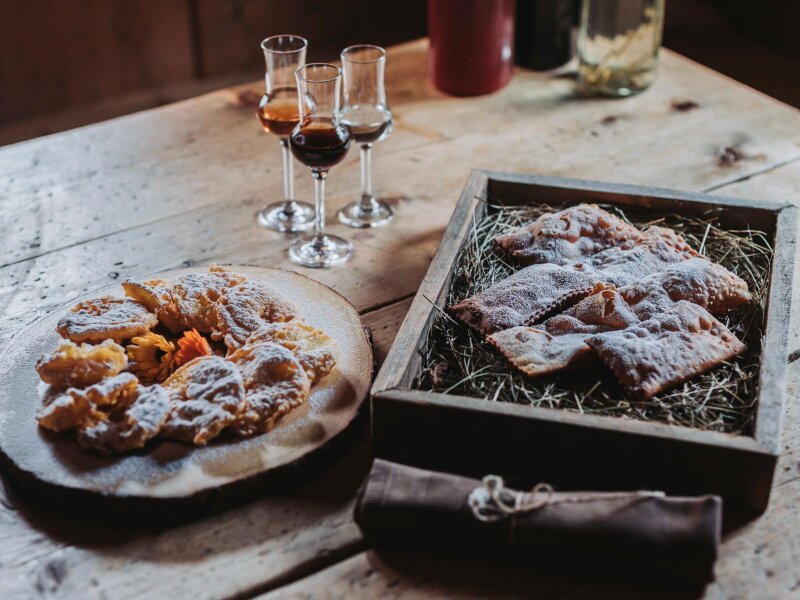 To finish, you can enjoy something sweet, such as a curd cheese pancake with blueberry jam or a chestnut dessert with persimmon and hazelnut. This is fitting, as the autumn culinary tradition of Toerggelen is widely celebrated in the Val Passiria, and sweet chestnuts are in peak season from October onwards. Naturally, these hearty dishes taste particularly good after a hike through the Val Passiria in the autumn. Enjoy your meal!
