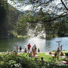 A moor bathing lake on the Val Pusteria Sun Road invites you to swim and enjoy a pizza in the evening in summer