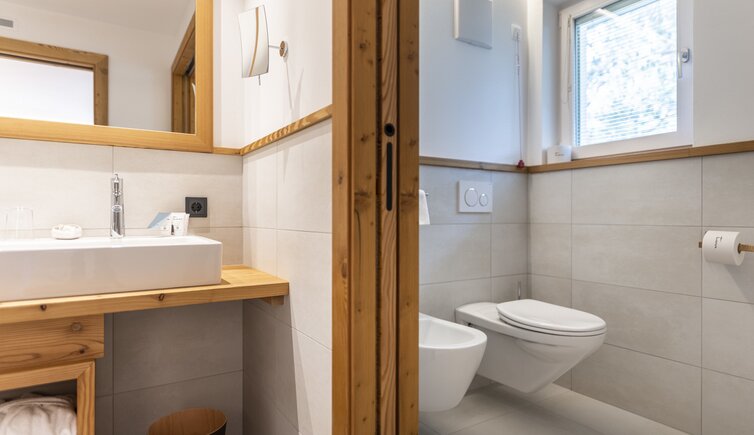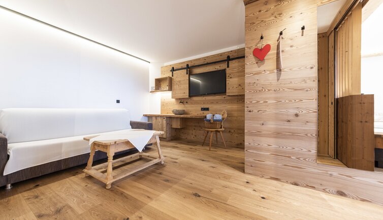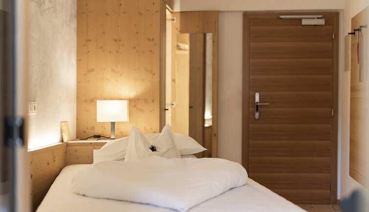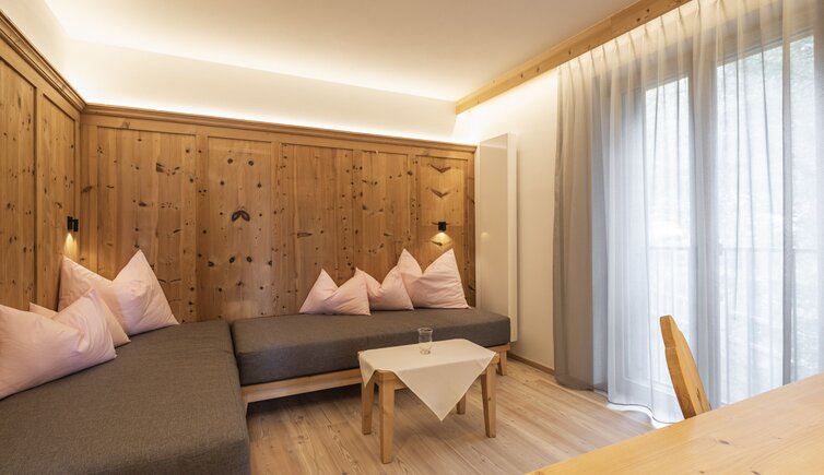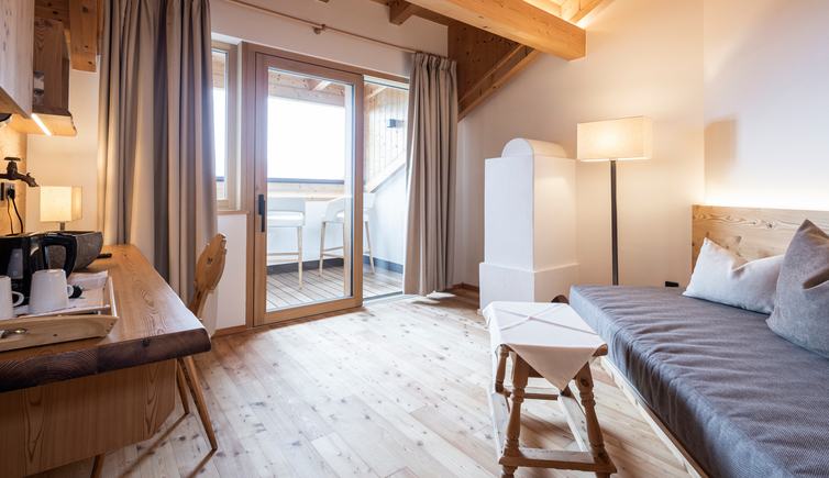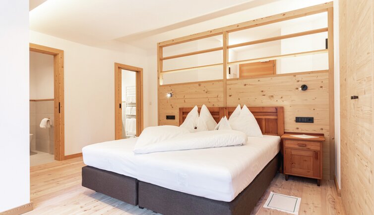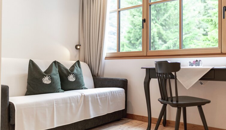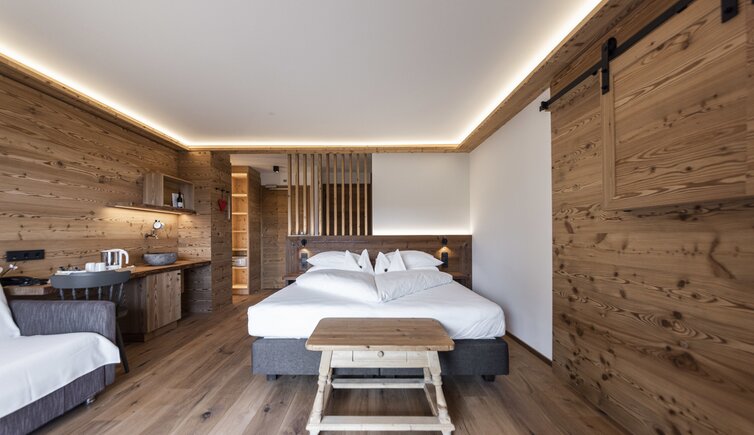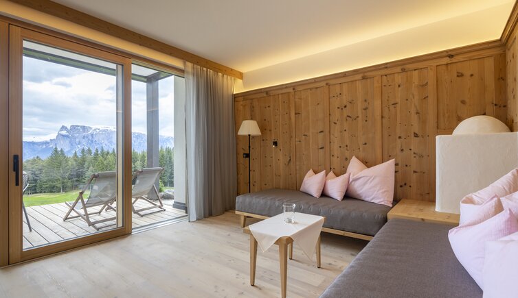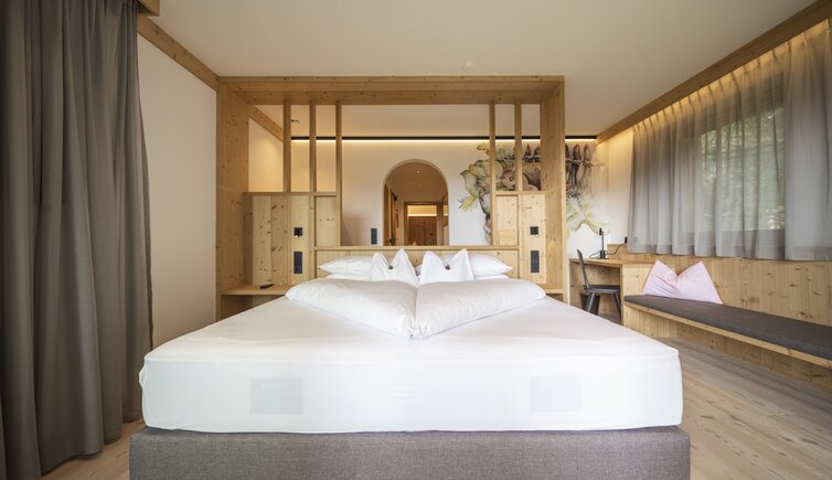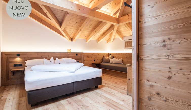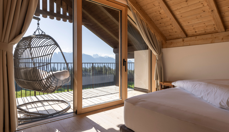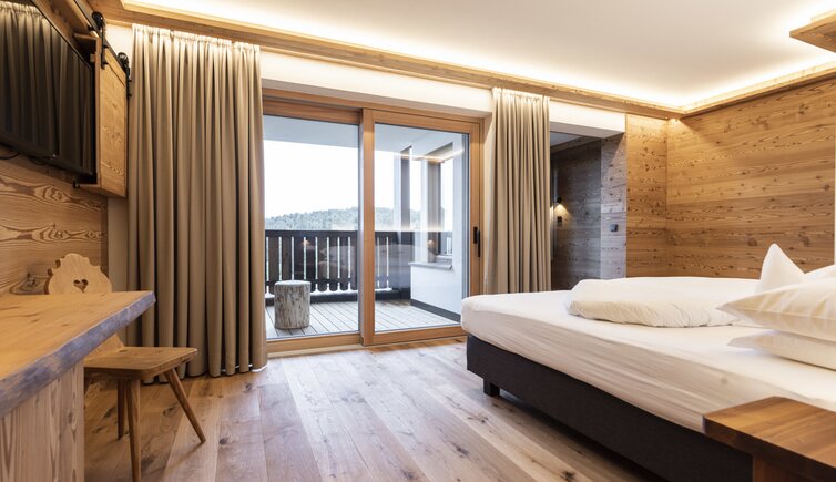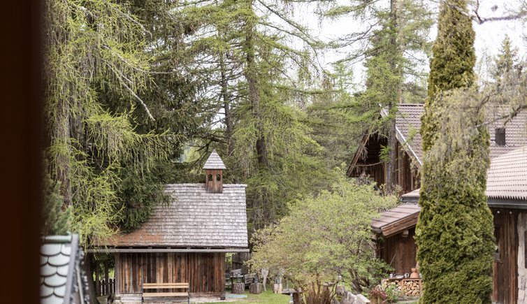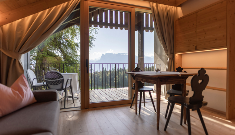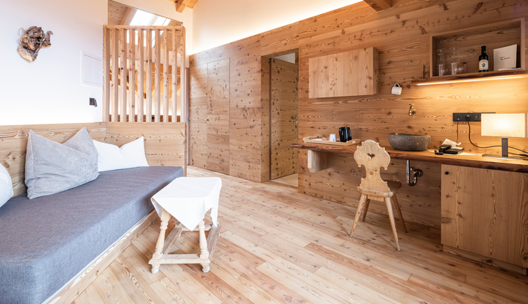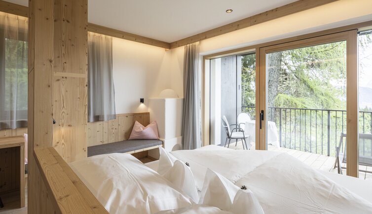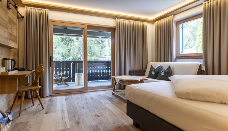 Situated in a forest clearing, surrounded by gentle mountain meadows and the fir forest, a dreamlike view on the mountain world of the Dolomites, World Natural Heritage, opens up.