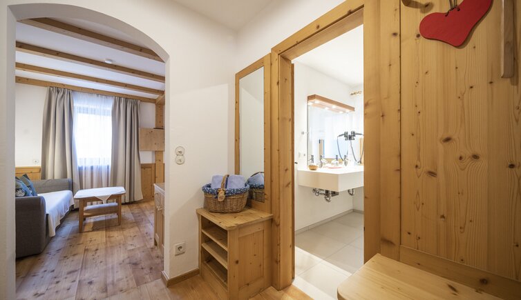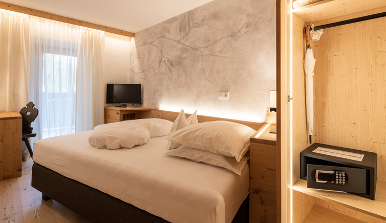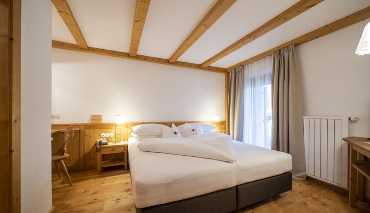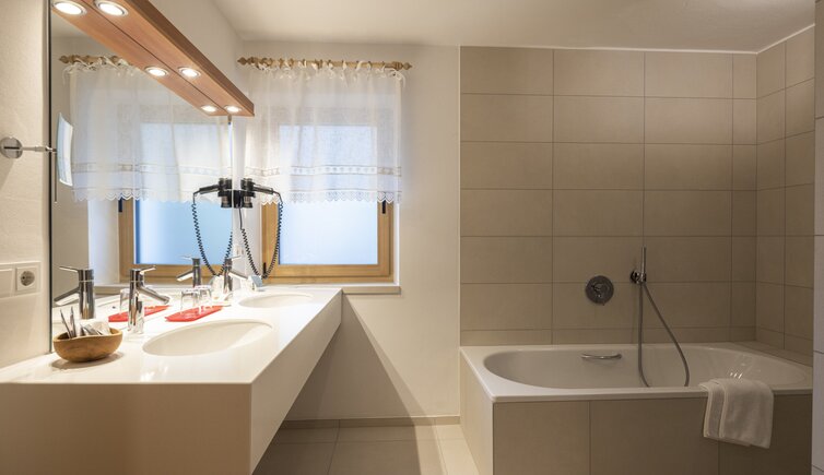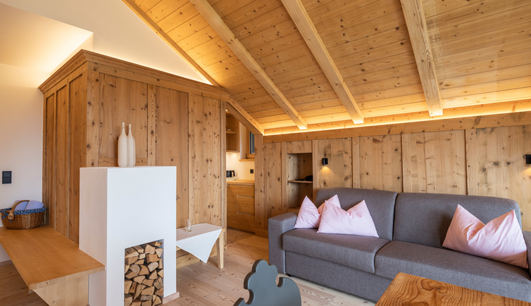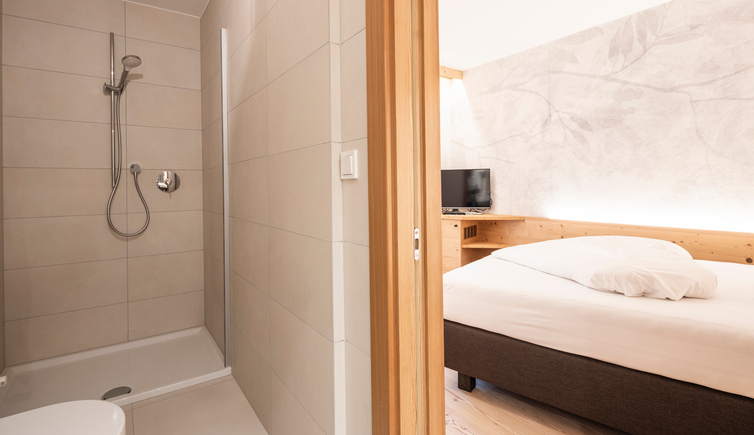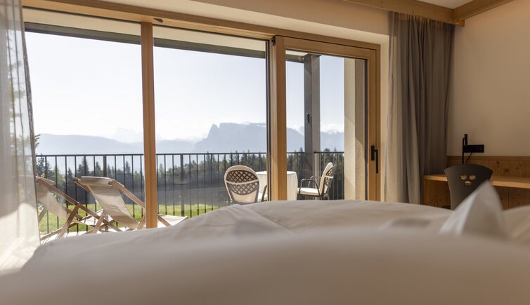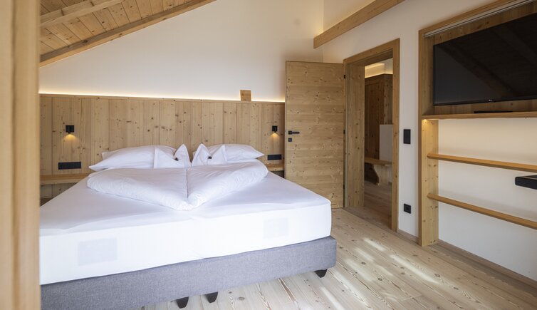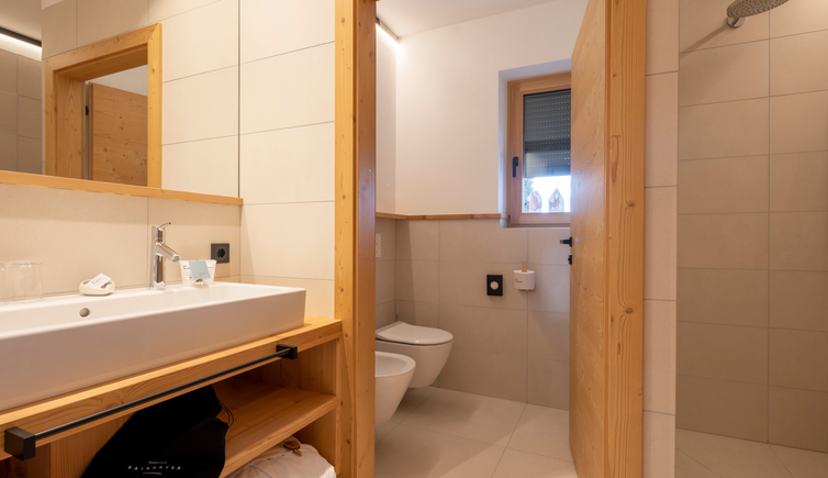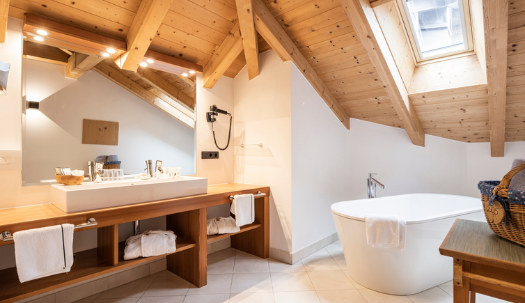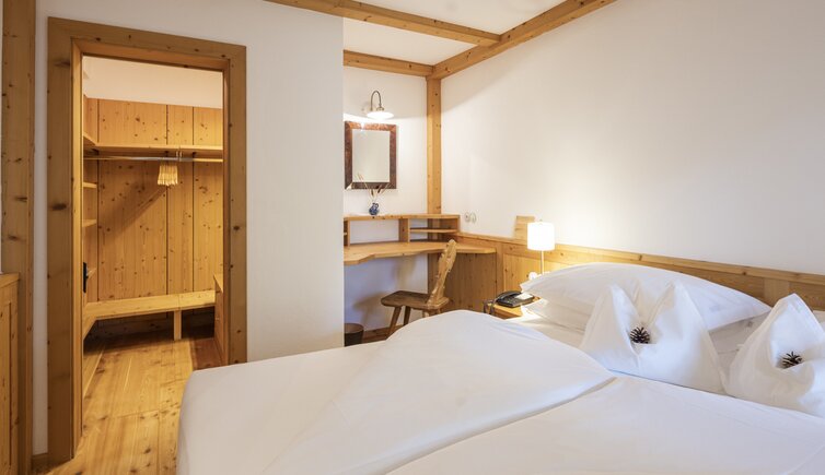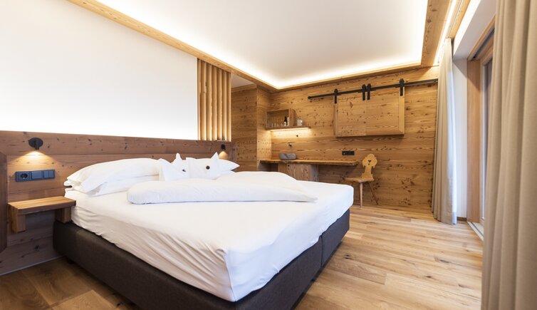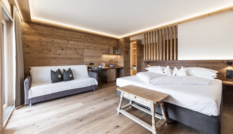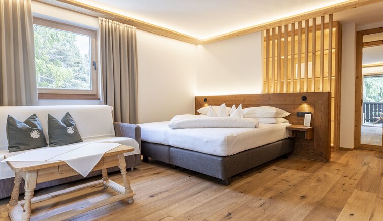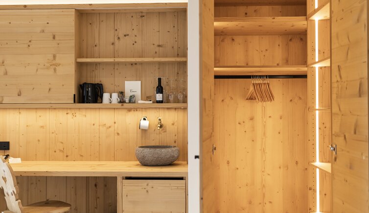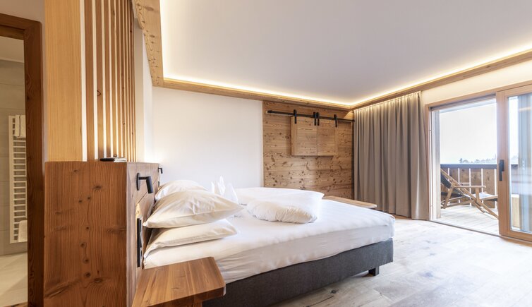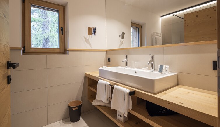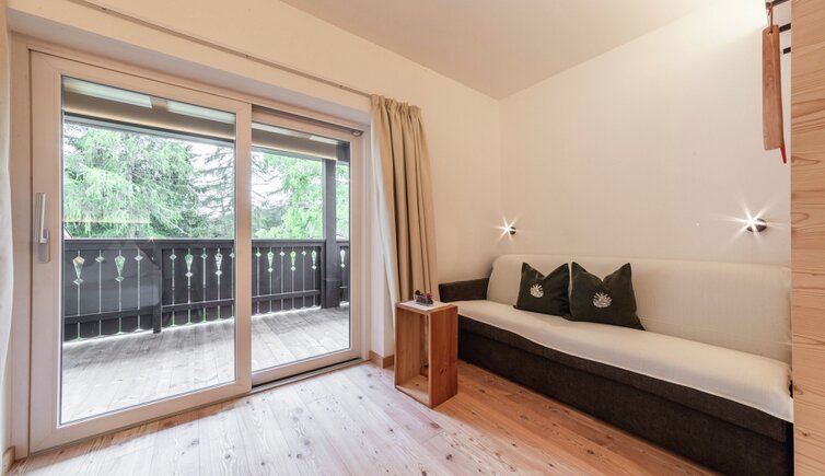 Situated in a forest clearing, surrounded by gentle mountain meadows and the fir forest, a dreamlike view on the mountain world of the Dolomites, World Natural Heritage, opens up.