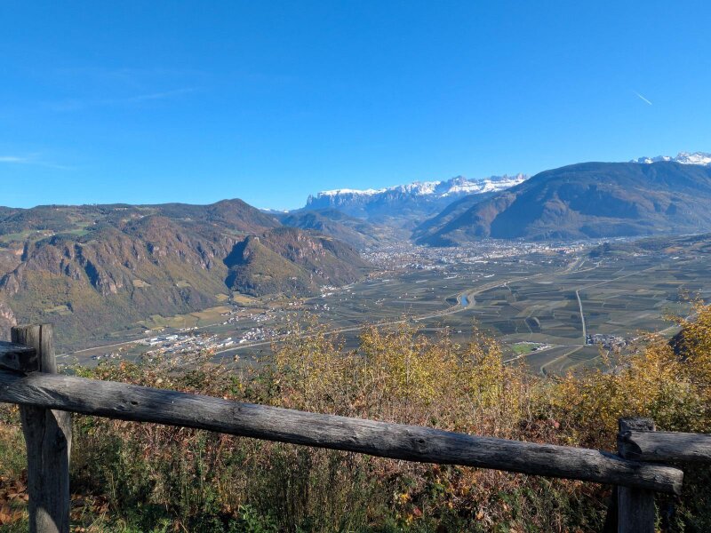 From San Michele, a well-maintained mountain road climbs to the elevated slopes above the Adige Valley. Especially in summer, the temperatures here are pleasantly cooler than in the valley below. The panoramic view of the regional capital, Bolzano, and the Dolomites beyond is breathtaking.