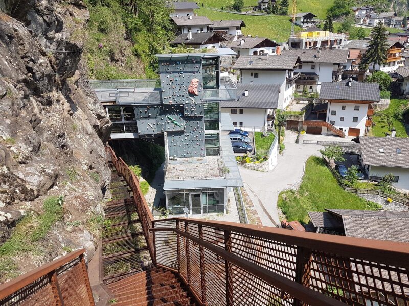The focus on adventure continues outdoors: The glass tower houses the Infopoint of the Gruppo di Tessa Nature Park, while the building features a climbing wall. Outside, there is an ibex enclosure and the Ibex Trail, a one-kilometre-long themed trail. A few metres away, the Passirio Gorge Trail takes a turn and returns to San Leonardo in Passiria via impressive steel structures.
