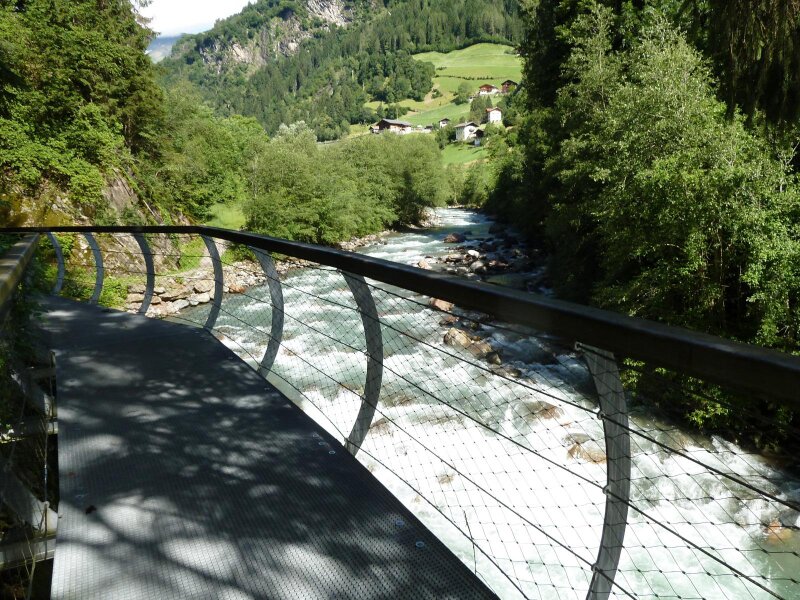The power of water is also illustrated on the "Passeirer Schluchtenweg" trail, which begins in San Leonardo and leads past Gomion. Via steel structures and stairs, the route brings you through the imposing Passirio Gorge to the exit at Moso in the Upper Val Passiria.
