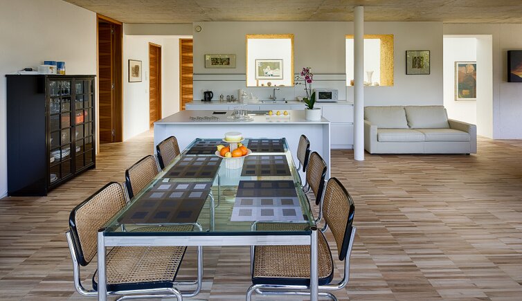Nell’appartamento dai soggiorni completamente vetrati, l’immersione nella natura circostante è rilassante.
