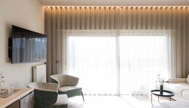 Accogliente penthouse suite con elegante pavimento in legno, splendida loggia panoramica esposta a sud e vista su Merano e la valle.