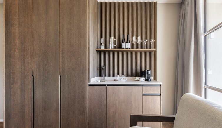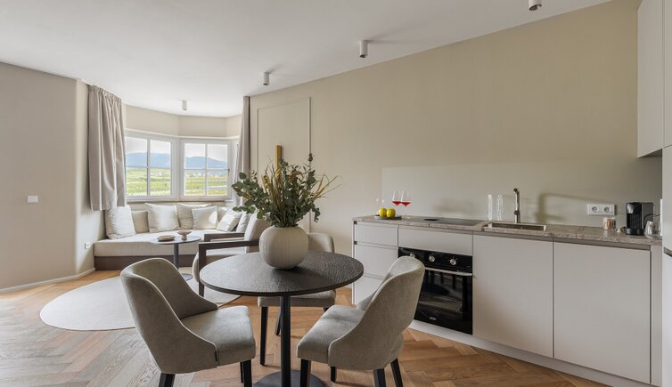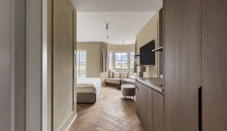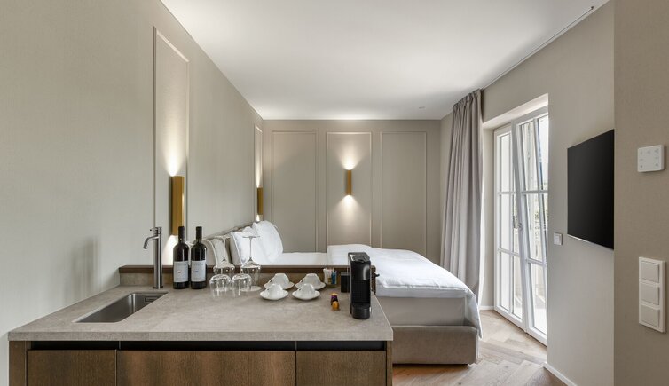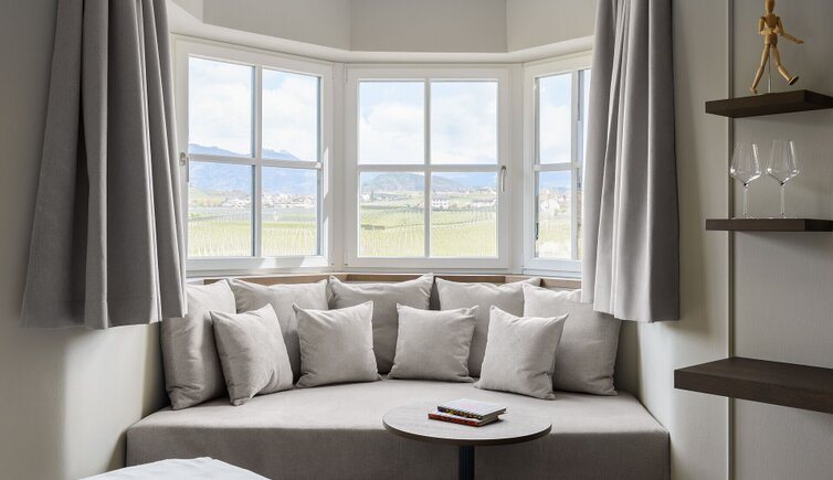 Le 16 suite e gli appartamenti offrono un ambiente unico ed elegante e sono arredati con grande attenzione ai dettagli. La vista dalla finestra offre un affascinante panorama sulle montagne dell’Alto Adige e sul paesaggio mediterraneo circostante.