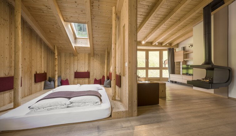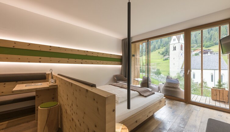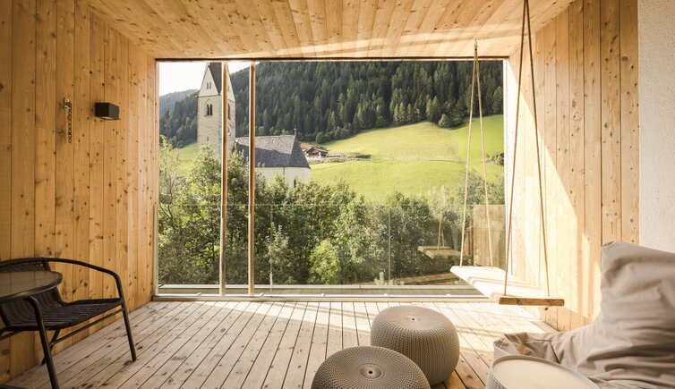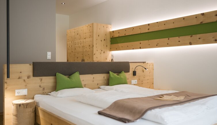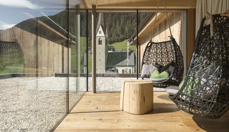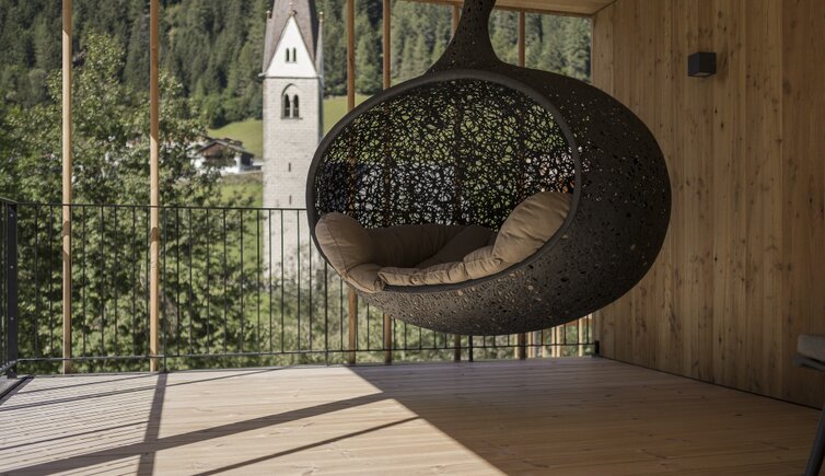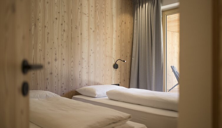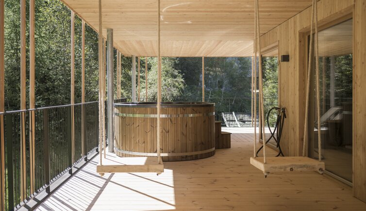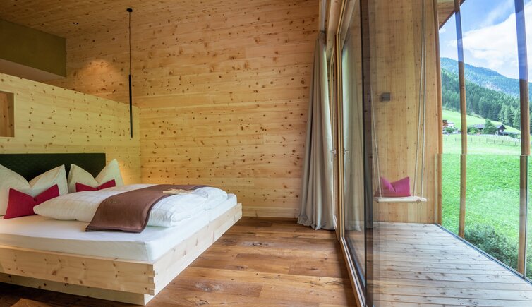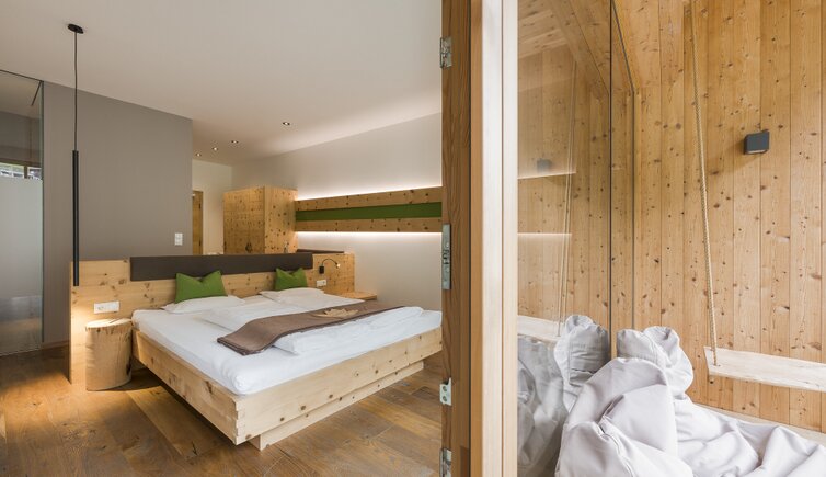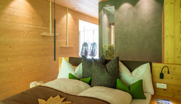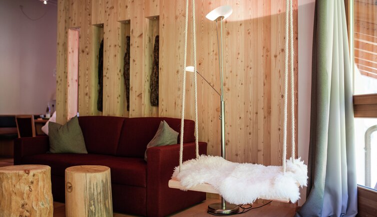Le straordinarie camere naturali, arredate con materiali locali, promettono un relax totale. Le altalene in cirmolo fatte a mano in ogni stanza faranno rilassare l’anima, permettendovi di godere appieno la vostra vacanza!
