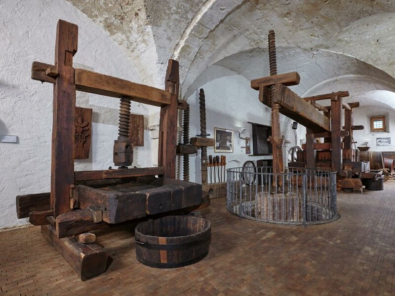 Inoltre, troverai oggetti esposti in vetro e ceramica, informazioni sul rapporto tra vino e religione e antichi attrezzi agricoli come torchi, botti e tini. Un'attenzione particolare è dedicata alla professione del "Saltner", l'antico guardiano dei campi che, fino al 1914, sorvegliava l'uva.