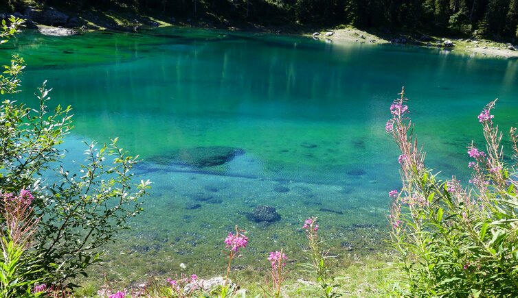 Questa è la ragione, perché ancora oggi il Lago di Carezza sotto le imponeti pareti del Catinaccio e del Latemar risplende tutti gli stupendi colori dell'arcobaleno, dall'azzurro al verde, e dal rosso all'indaco. In lingua ladina, il lago è noto come "Lec de Ergobando", Lago dell'Arcobaleno.