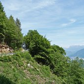 Raggiungiamo l'incrocio con il percorso n. 9. Ripartiamo in sella in direzione nord sulla forestale che a tratti coincide con l'Alta Via di Appiano, ed a tratti la fiancheggia. Salite dolci e poi una discesa sempre più percepibile. Seguiamo le indicazioni per Buchwald (Faedo), il grande prato fiorito con il noto ristorante (chiuso). L'ultimo pezzo è su strada asfaltata. Da qui abbiamo una bella vista su Bolzano e le Dolomiti. Dopo una pausa, scendiamo sulla stradina asfaltata che poi si innesta nella provinciale di Predonico (Via Monte di Appiano) che percorriamo in direzione San Michele.