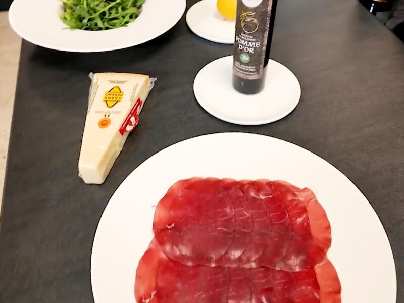 - Disporre in modo ordinato la bresaola tagliata finemente sul piatto.