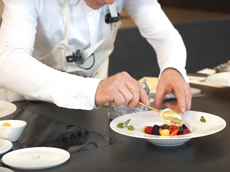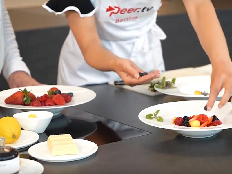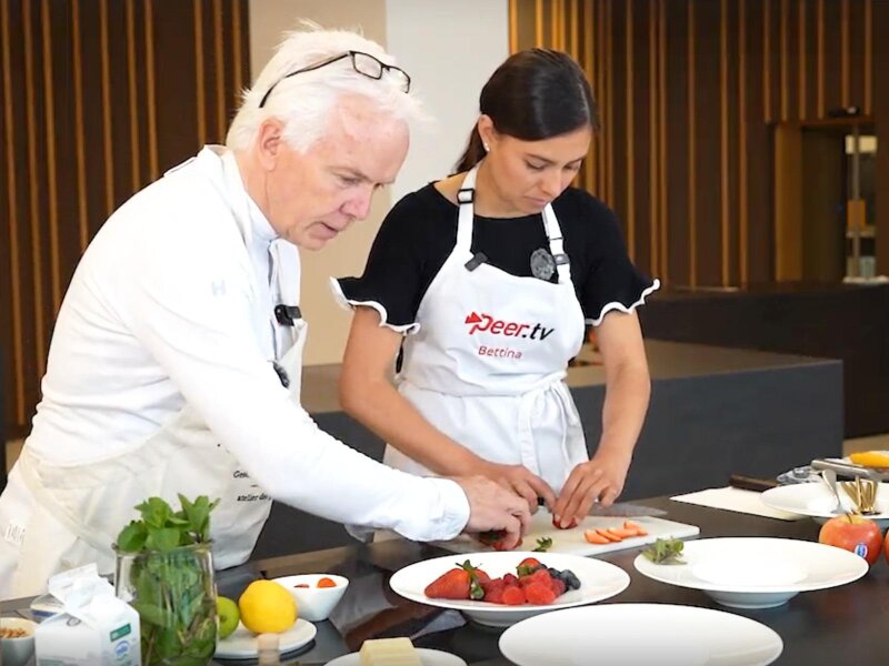 Fragole e lamponi freschi vengono accompagnati da succo di mela dell'Alto Adige e panna. A completare il tutto si aggiungono un pregiato aceto balsamico di mele e scaglie di cioccolato bianco: una vera gioia per il palato!