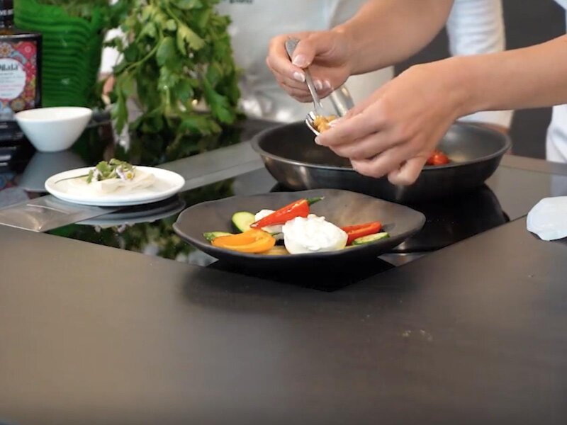 - Impiattare con cura le verdure, i ceci e le perle di mela.