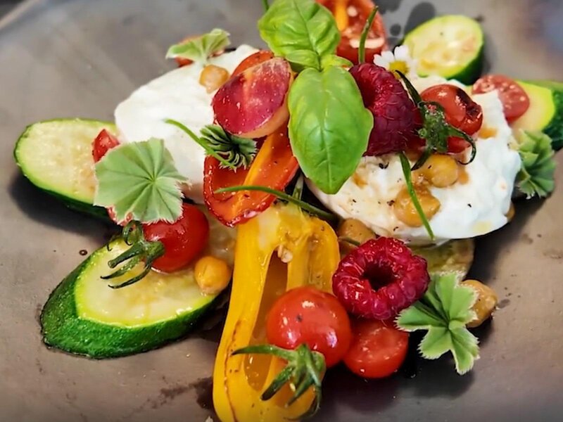 Verdure grigliate mediterranee, ceci ricchi di proteine e burrata, il tutto impreziosito da un profumato aceto balsamico di mele
