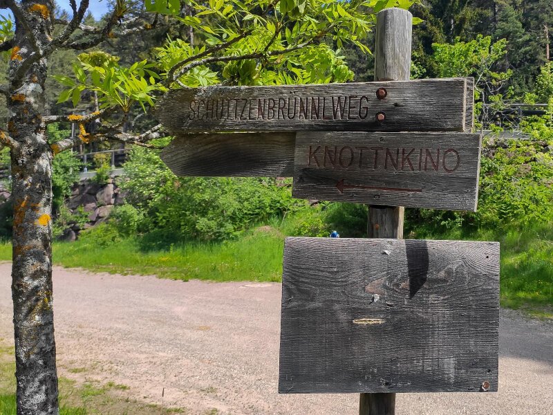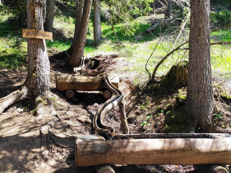 Un cartello in legno ci indica "Knottnkino" e "Schützenbrünnlweg". Lo Schützenbrünnlweg è il sentiero n. 12a: ci conduce nel bosco lungo un'ampia strada forestale. A un bivio, proseguiamo a destra, sempre sullo Schützenbrünnlweg, in leggera salita, fino a quando capiamo da dove derivi il suo nome: davanti a noi appare la "Schützenbrünnl" vero e propria, una fontana con sorgente.