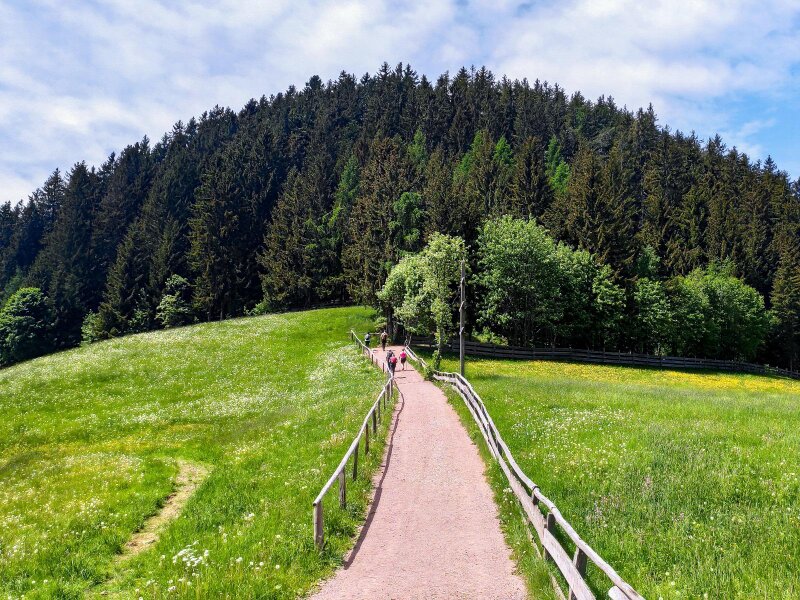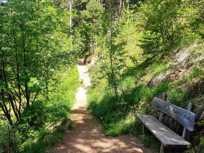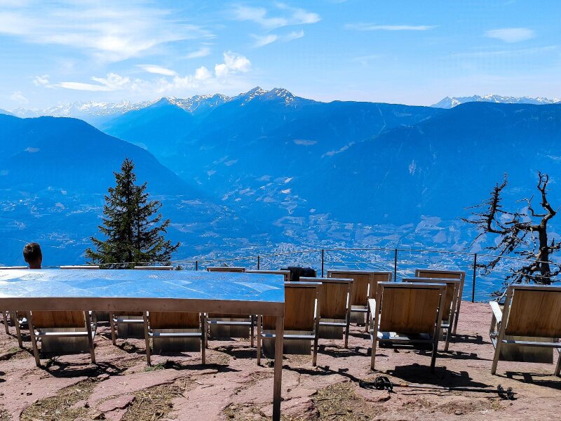 Dopodiché, la salita si fa più ripida. Saliamo sul Rotsteinkogel, una roccia porfirica a 1.465 metri di altitudine e un bellissimo punto panoramico, valorizzato dal "Knottnkino", il "Cinema sulla Roccia". Le sedie in acciaio e legno di castagno sono resistenti alle intemperie e contribuiscono a dare la sensazione di essere seduti in un cinema: in questo caso, la regia è della natura.