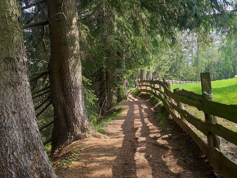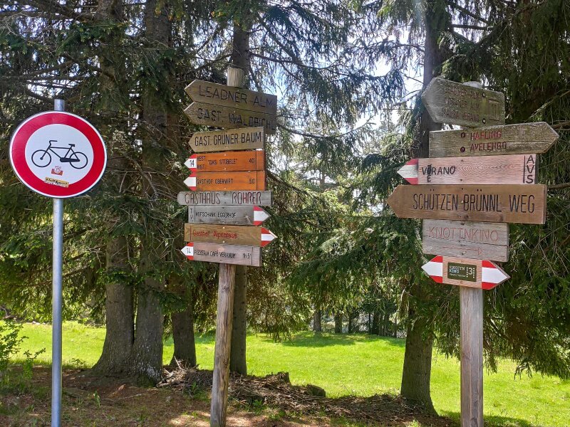 Il paese di Verano si trova sul Monzoccolo, la terrazza soleggiata di Merano, ed è una splendida area escursionistica. Siamo in macchina e parcheggiamo dietro la locanda "Grüner Baum", dove in questa giornata di maggio il sentiero ci attende. Il clima nel Meranese è già piacevolmente mite, la fioritura dei meli è passata da qualche settimana e si fa sentire l'inizio dell'estate.