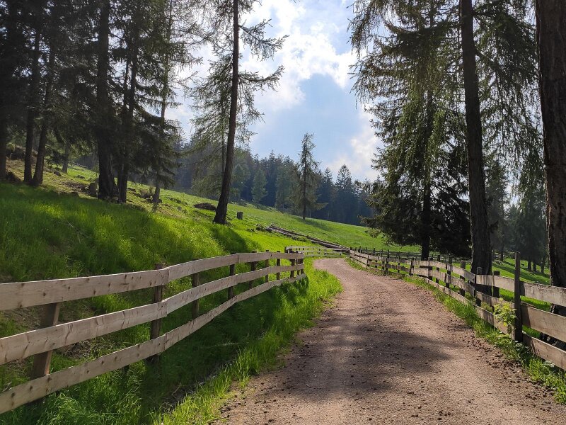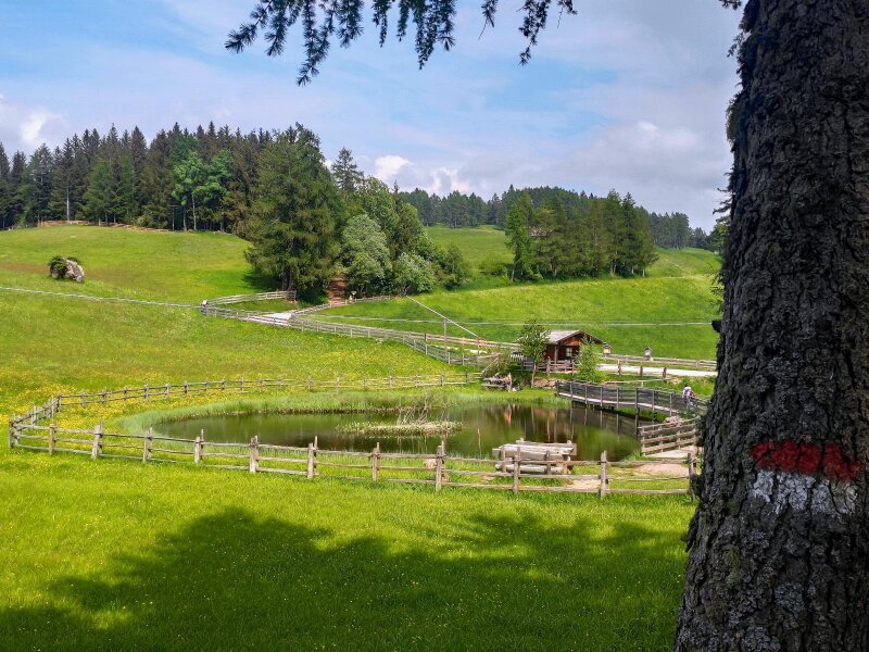Il sentiero si restringe e a più riprese si apre la vista sui prati e sui masi del Monzoccolo. Raggiunto un pianoro, troviamo numerosi cartelli: continuiamo a seguire lo Schützenbrünnlweg. La vista spazia fino al massiccio del Latemar, alla Pala di Santa, al Corno Bianco e al Corno Nero.