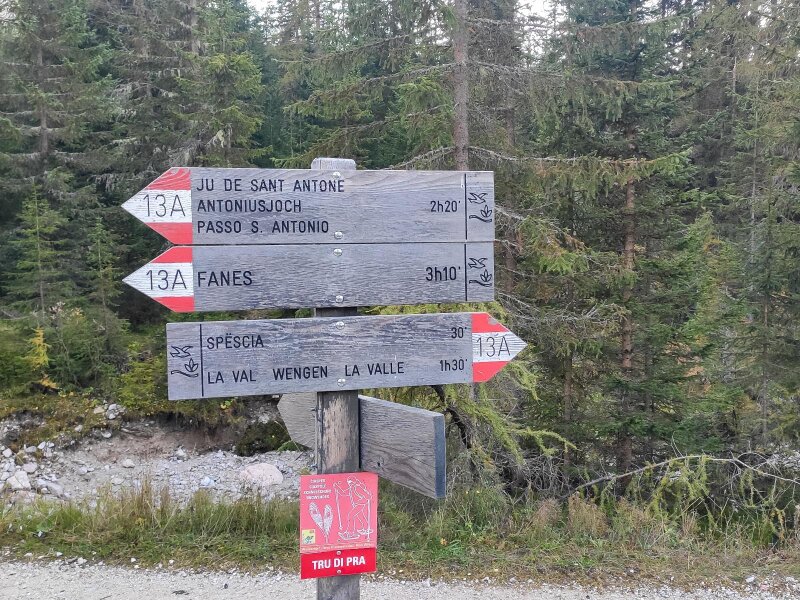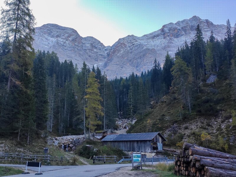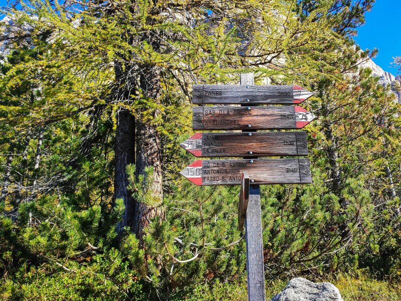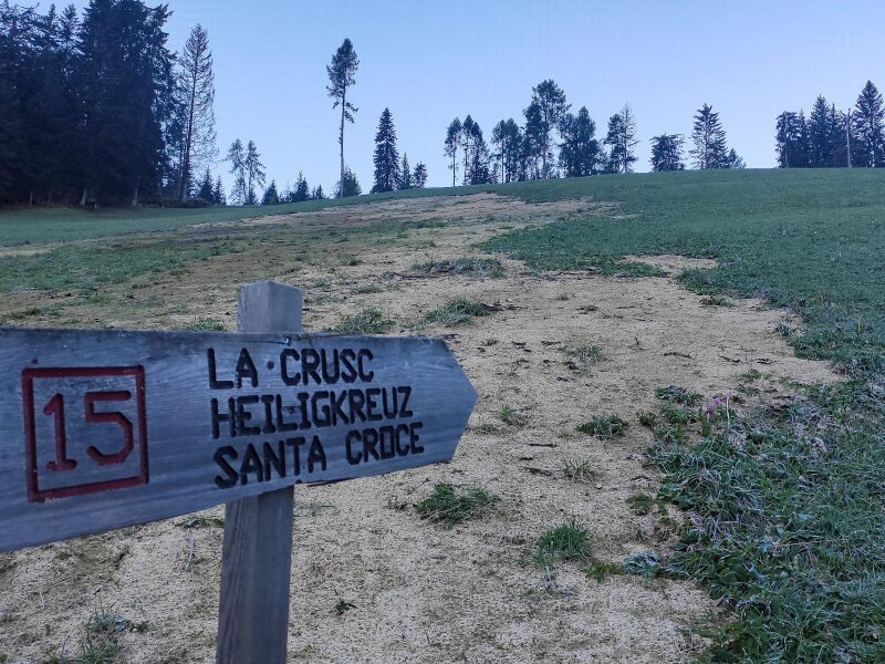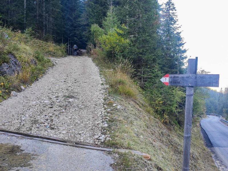 La Val, il primo paese escursionistico certificato dell'Alto Adige, è il punto di partenza della nostra gita sotto le pareti del Sasso di Santa Croce. Lasciamo la macchina al parcheggio Spëscia, da cui parte una strada asfaltata che prosegue fino all'incrocio con una via forestale: quest'ultima sale ed è segnalata con l'indicazione "La Crusc/Hl. Kreuz". Il simbolo sul cartello è quello della via crucis. È una fredda mattina di ottobre e il sentiero è ancora in ombra. Successivamente si attraversa un grande prato: al bivio seguente teniamo la destra, imboccando il sentiero che diventa il numero 15.