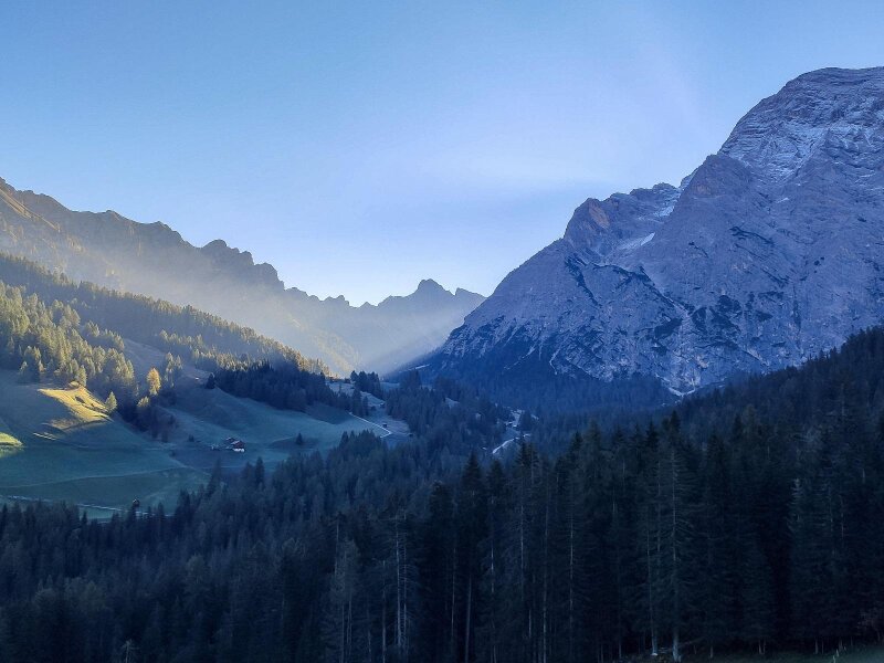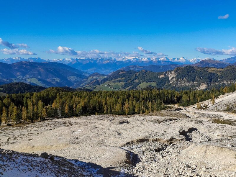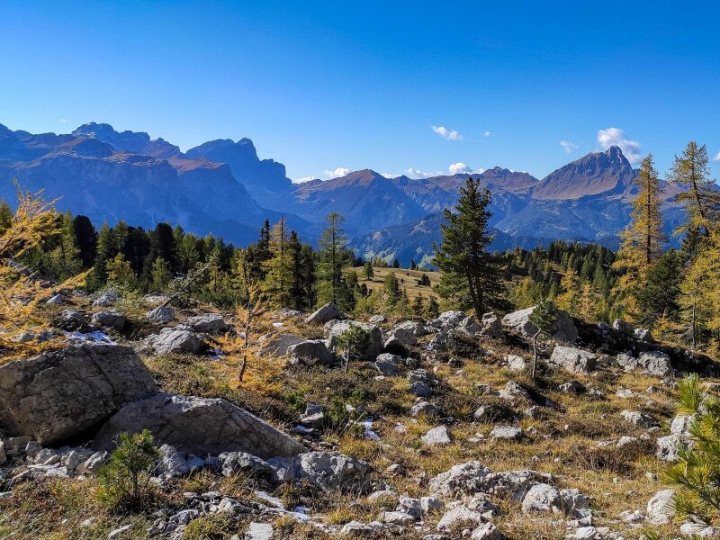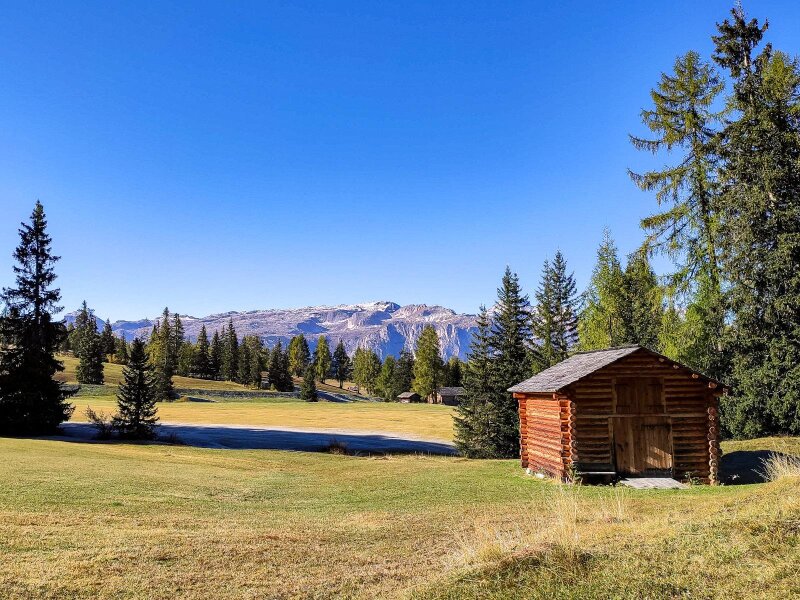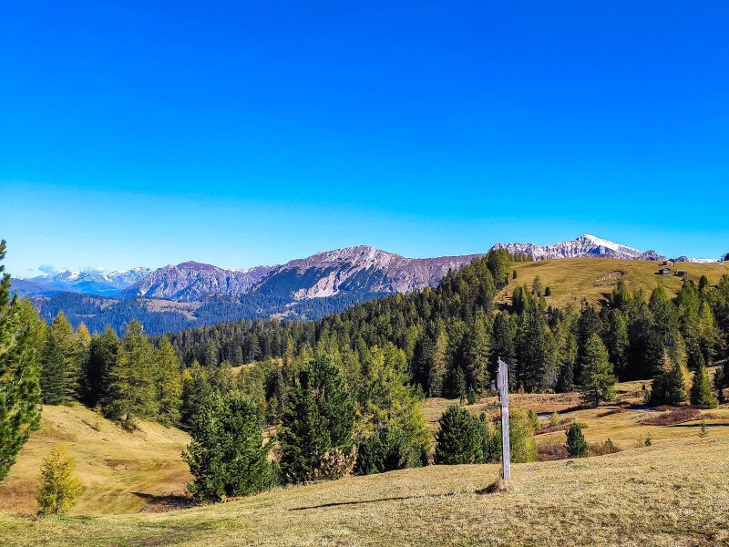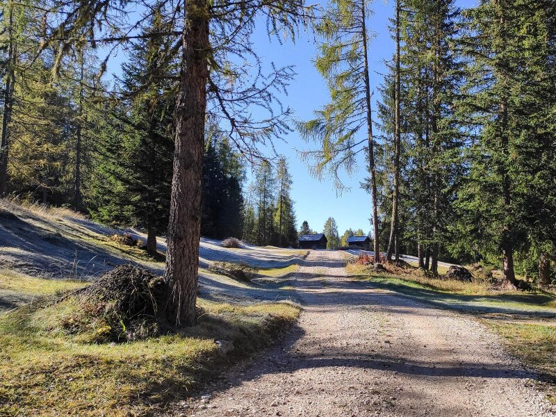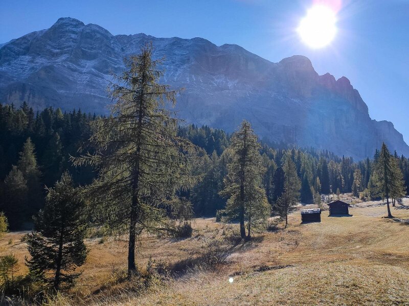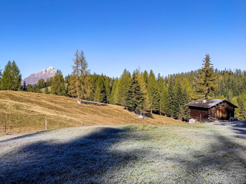 Lentamente il sole si fa strada, anche se la brina non vuole ancora sciogliersi. Il paesaggio diventa più alpino. Ancora un breve tratto, poi il bosco si dirada e lascia spazio ai Roda de Armentara, cioè ai protetti Prati dell'Armentara: si trovano al margine occidentale del Parco Naturale Fanes-Senes-Braies. Ci muoviamo in leggera salita attraverso i magnifici prati alpini, già tinti dei colori autunnali, sotto le pareti rocciose del Sasso di Santa Croce (Sas dla Crusc, in ladino).