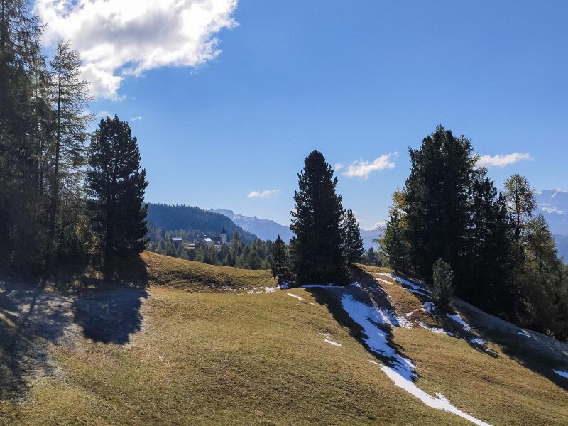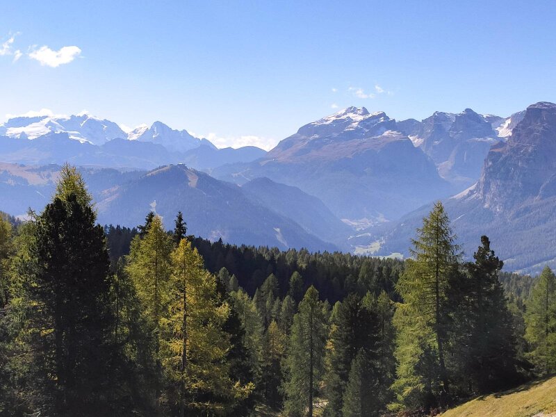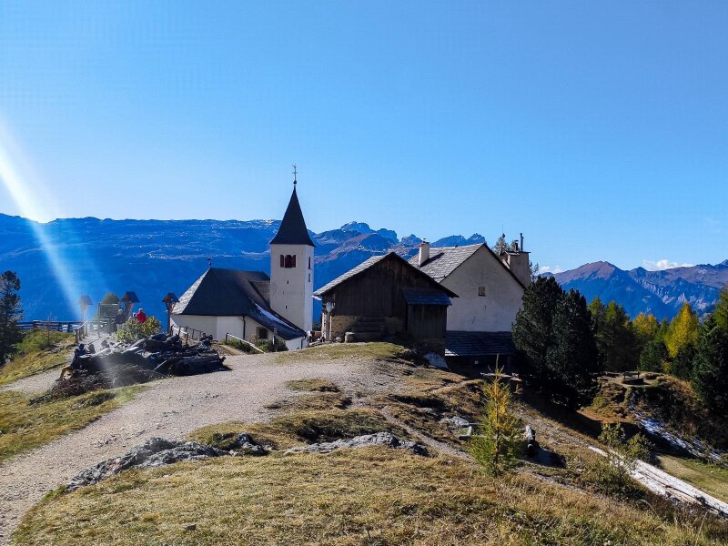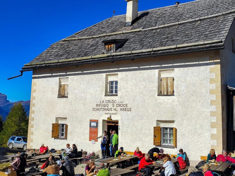 Su una piccola sella con delle panchine facciamo una pausa: di fronte a noi riconosciamo la Marmolada, il Gran Vernel e il Sella con la Cima Pisciadù e il Piz Boè. Ancora pochi metri e la nostra meta è in vista: il Santuario di Santa Croce, La Crusc. Si tratta di una cappella di pellegrinaggio con annesso un rifugio aperto al pubblico. Ci fermiamo al rifugio e ci godiamo il sole.