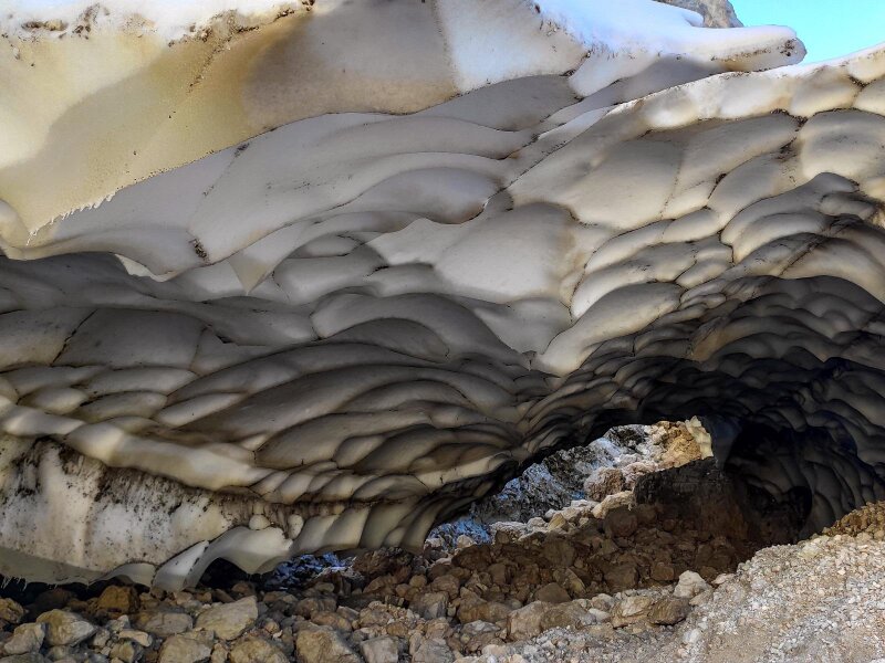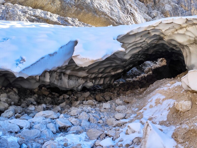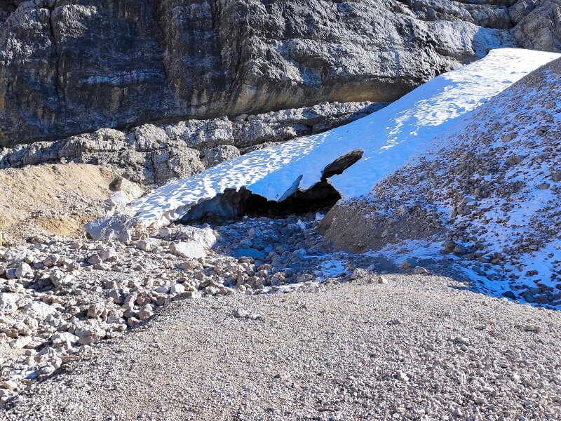 - L'accesso alla grotta di neve è vietato. È tuttavia permesso avvicinarsi all'ingresso per fotografare la cavità, ma bisogna prestare attenzione al pericolo di caduta massi. In autunno, inoltre, è necessario fare attenzione a eventuali nevicate! Il tempo di percorrenza totale indicato si riferisce alla sola camminata, escluse le pause e la sosta al rifugio.